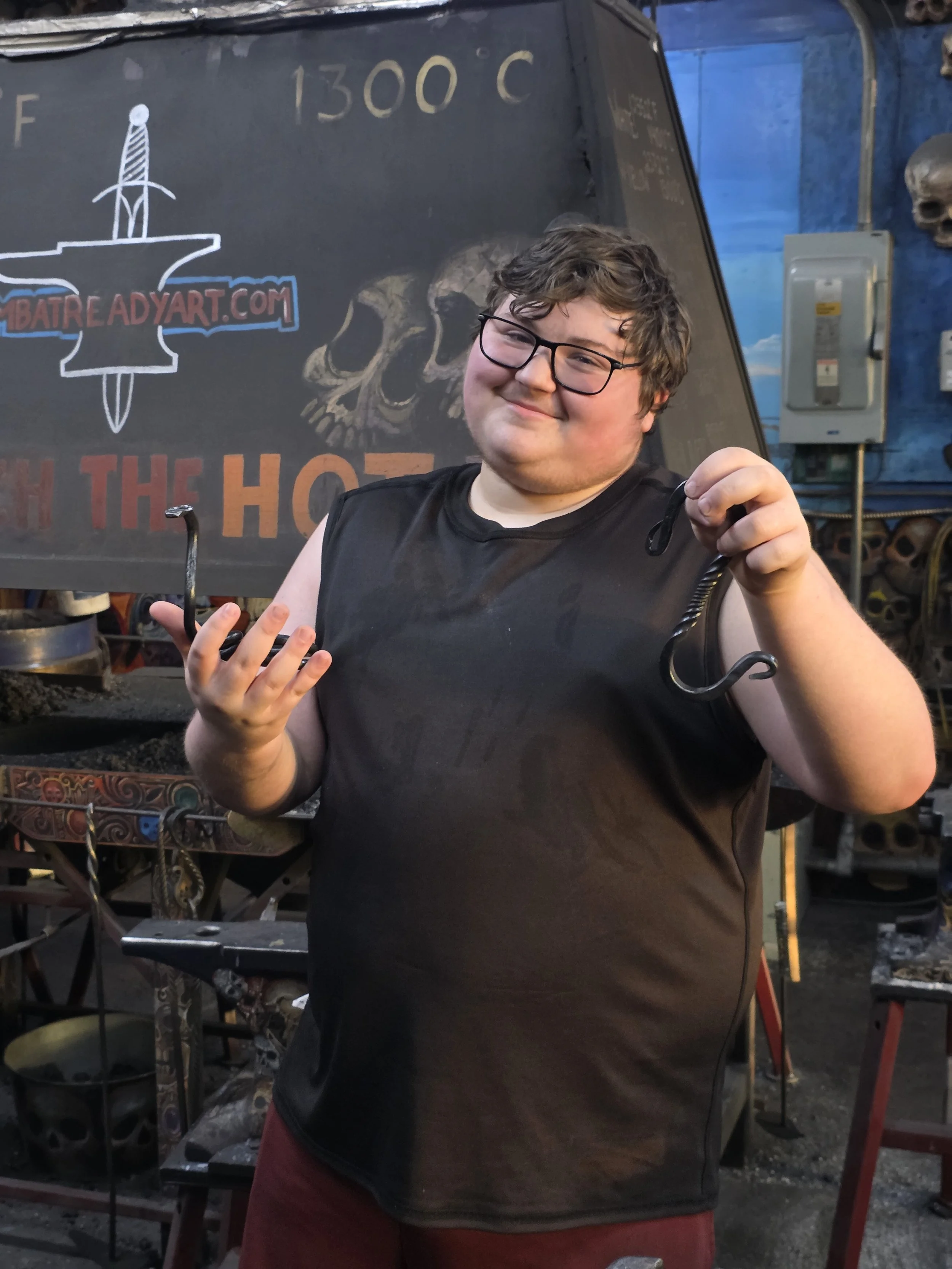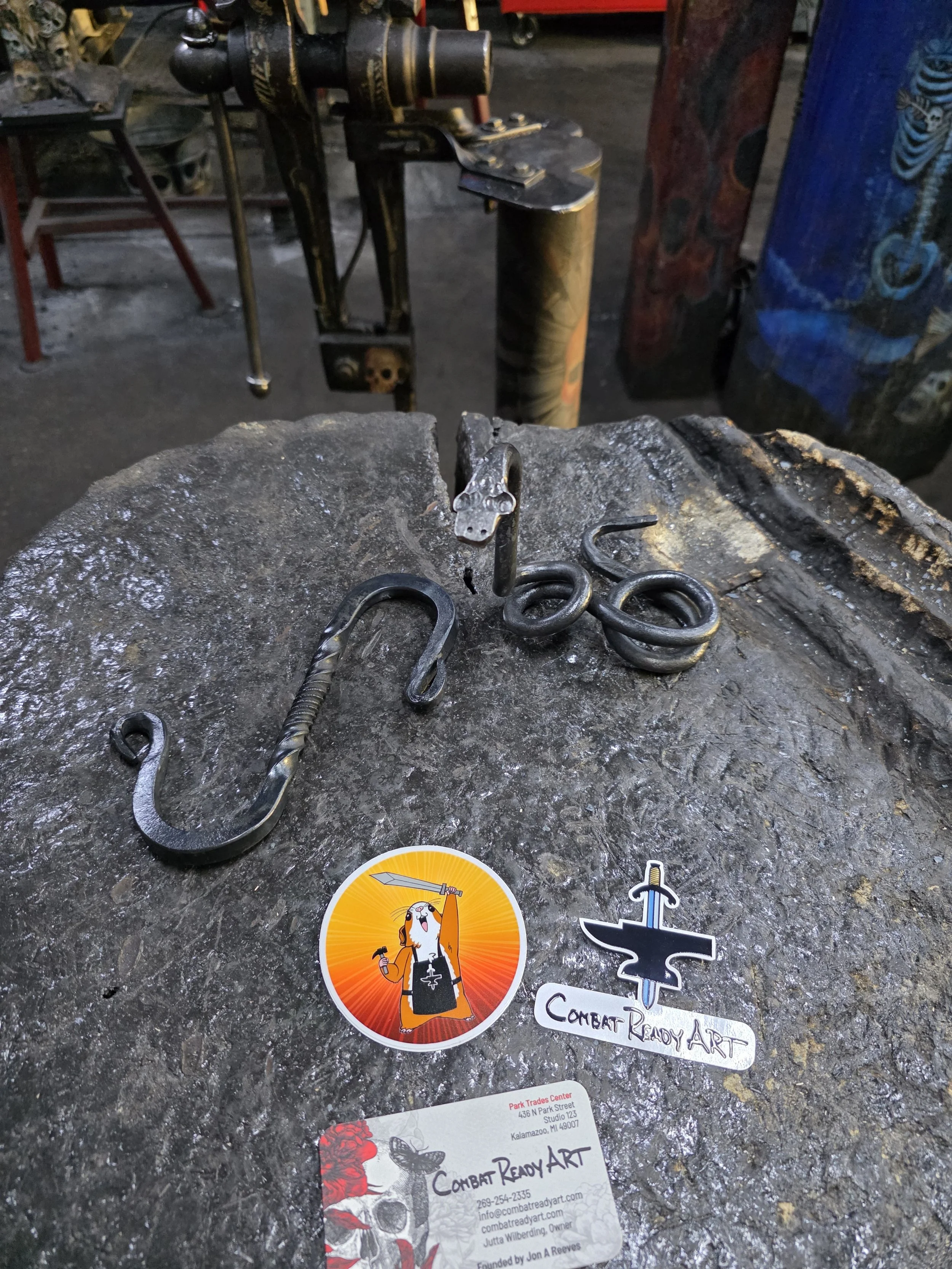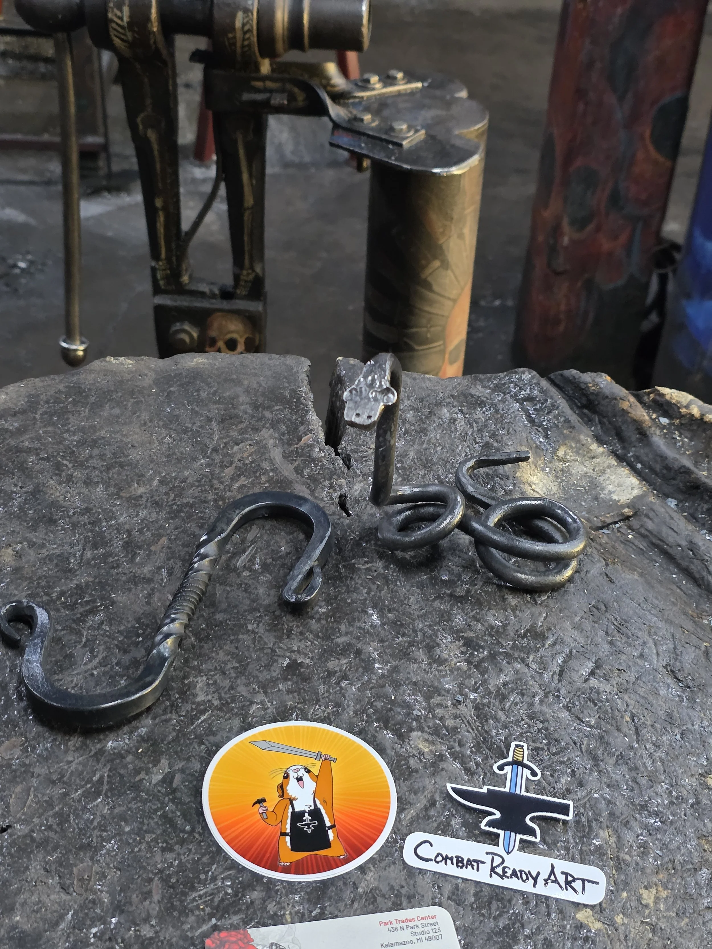 Kalten did a fantastic with his first time blacksmithing! He forged an "S" hook so fast, so he made a steel snake too!