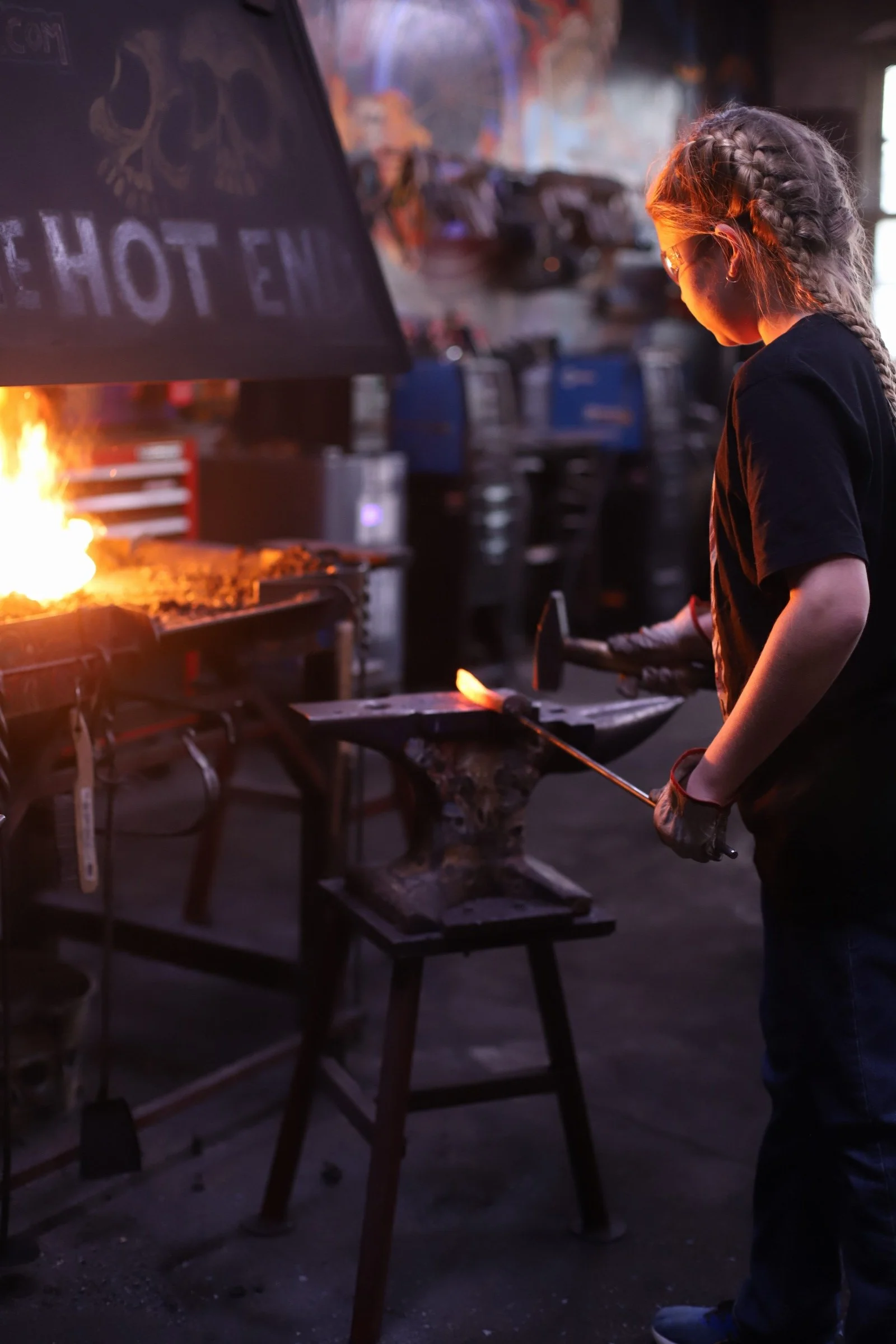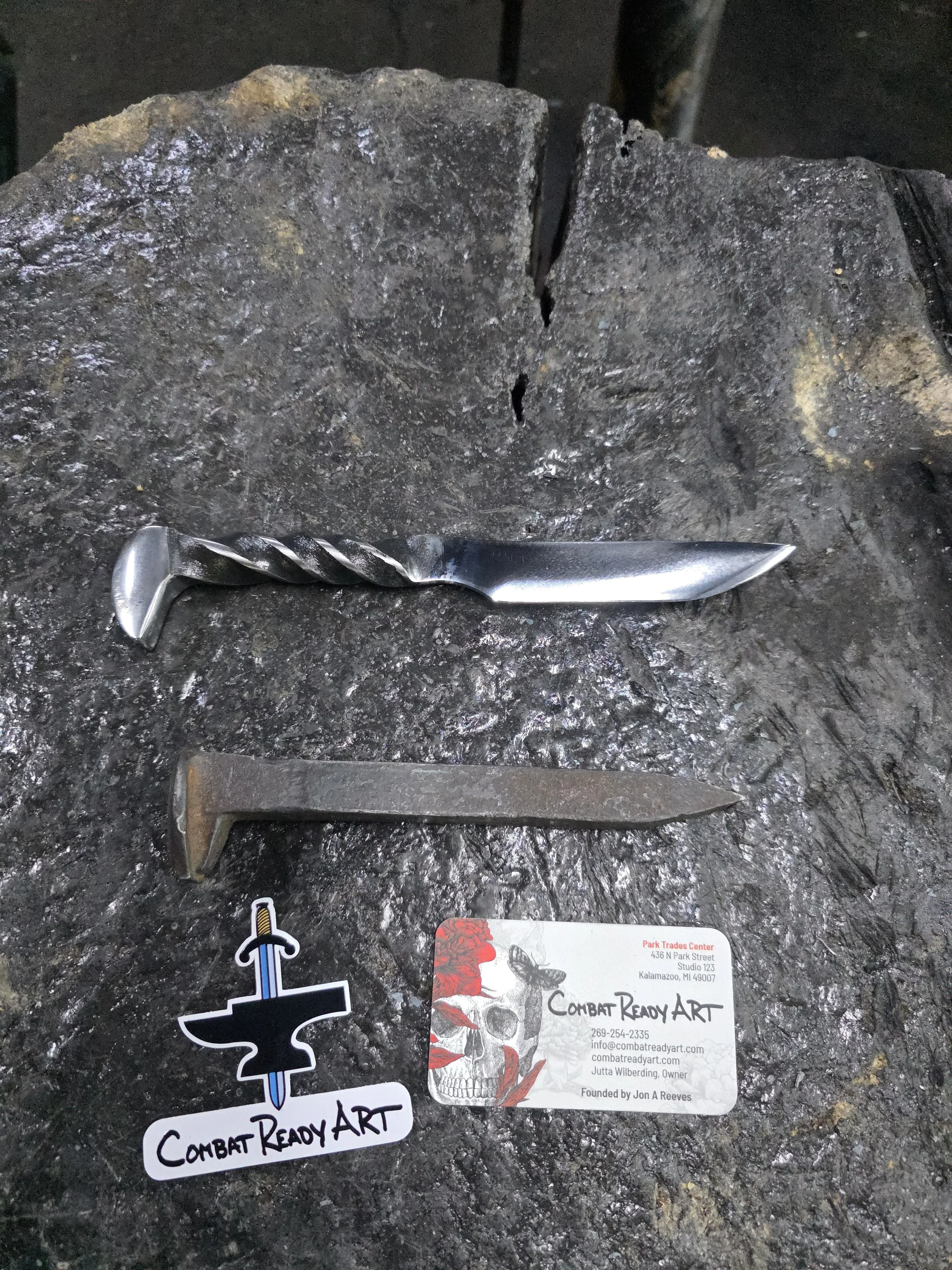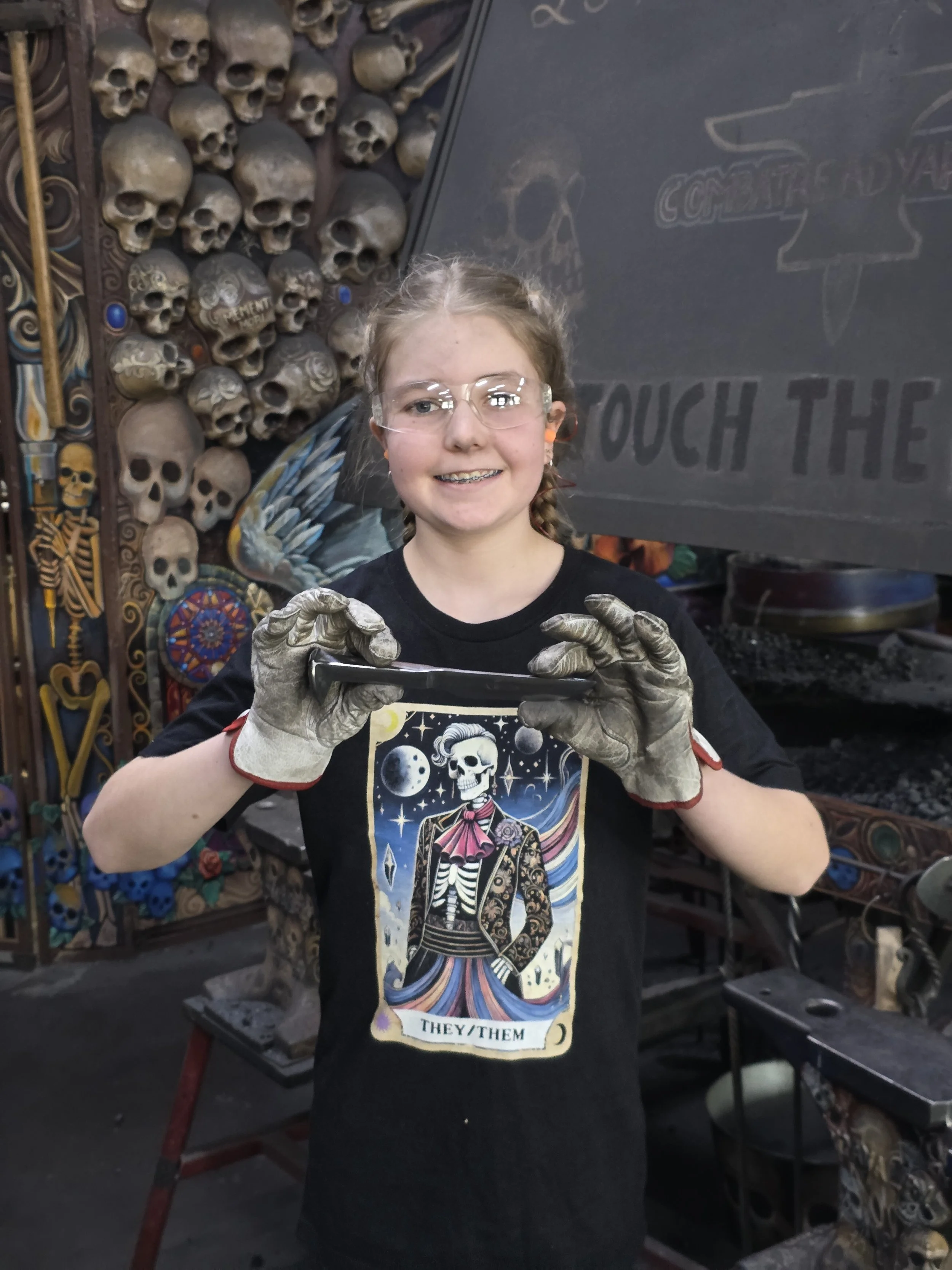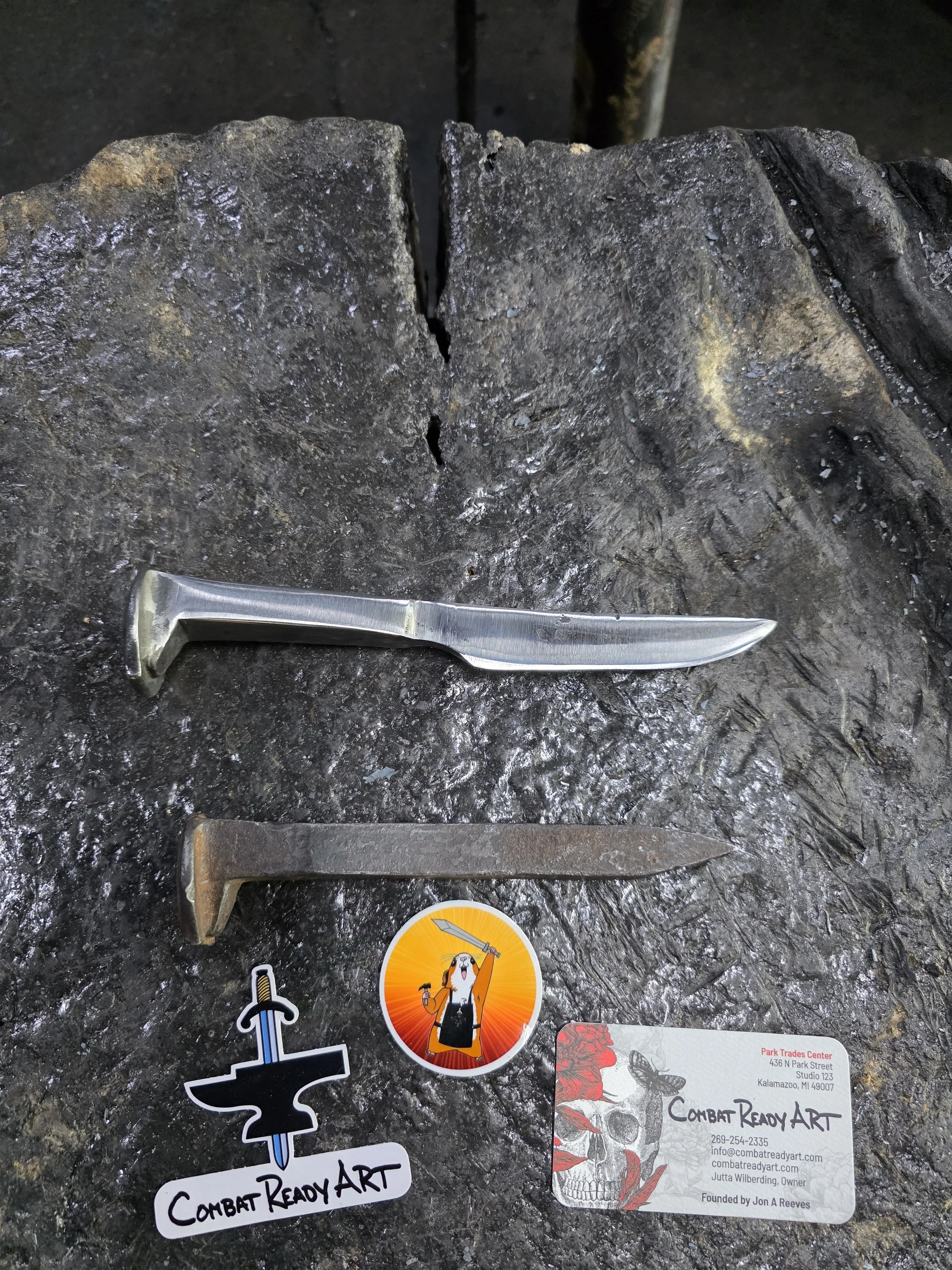 Gussy made a super shiny Railroad Spike Knife today in the forge! They're very interested in metalwork, but it was their first time blacksmithing. They did a fantastic job!