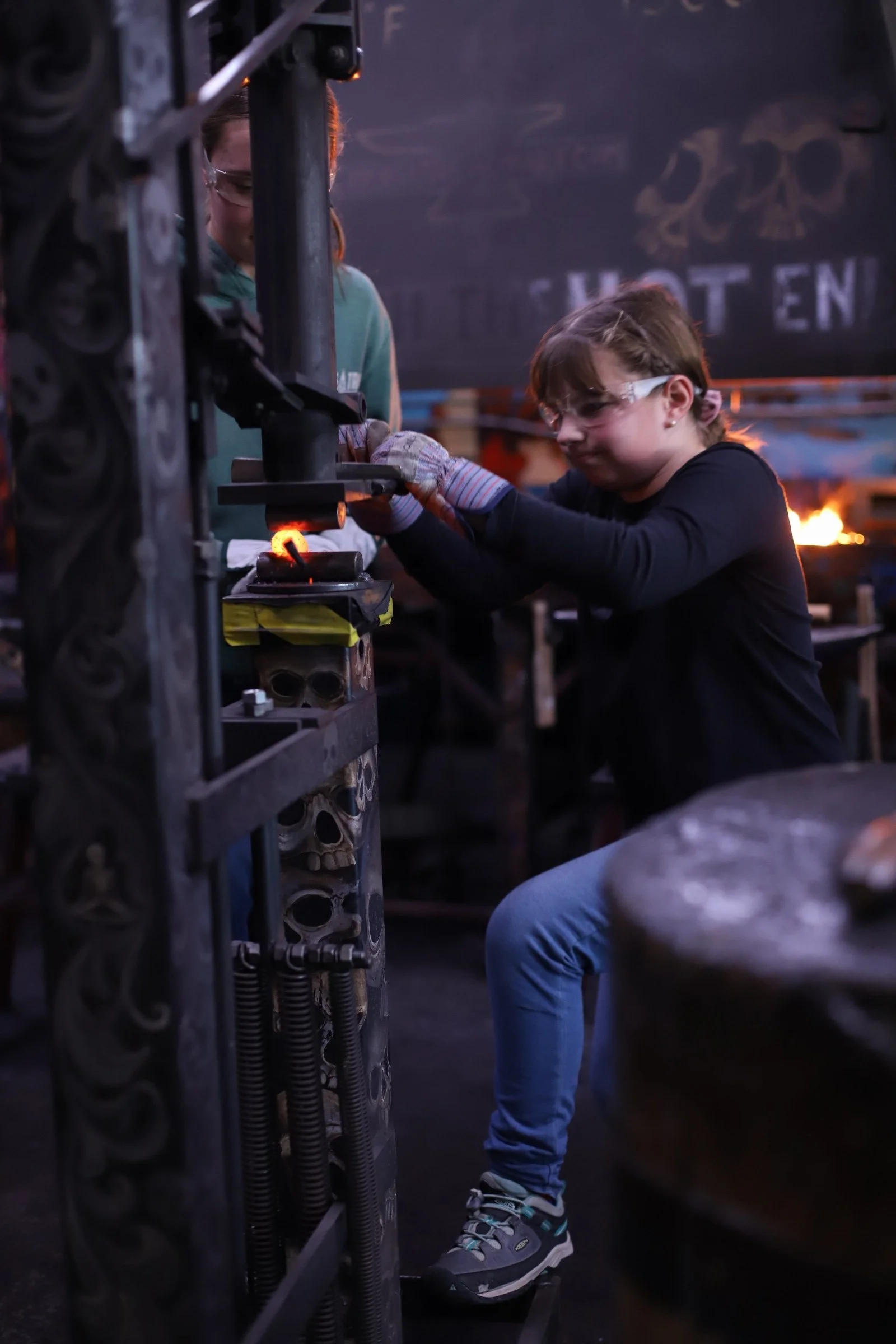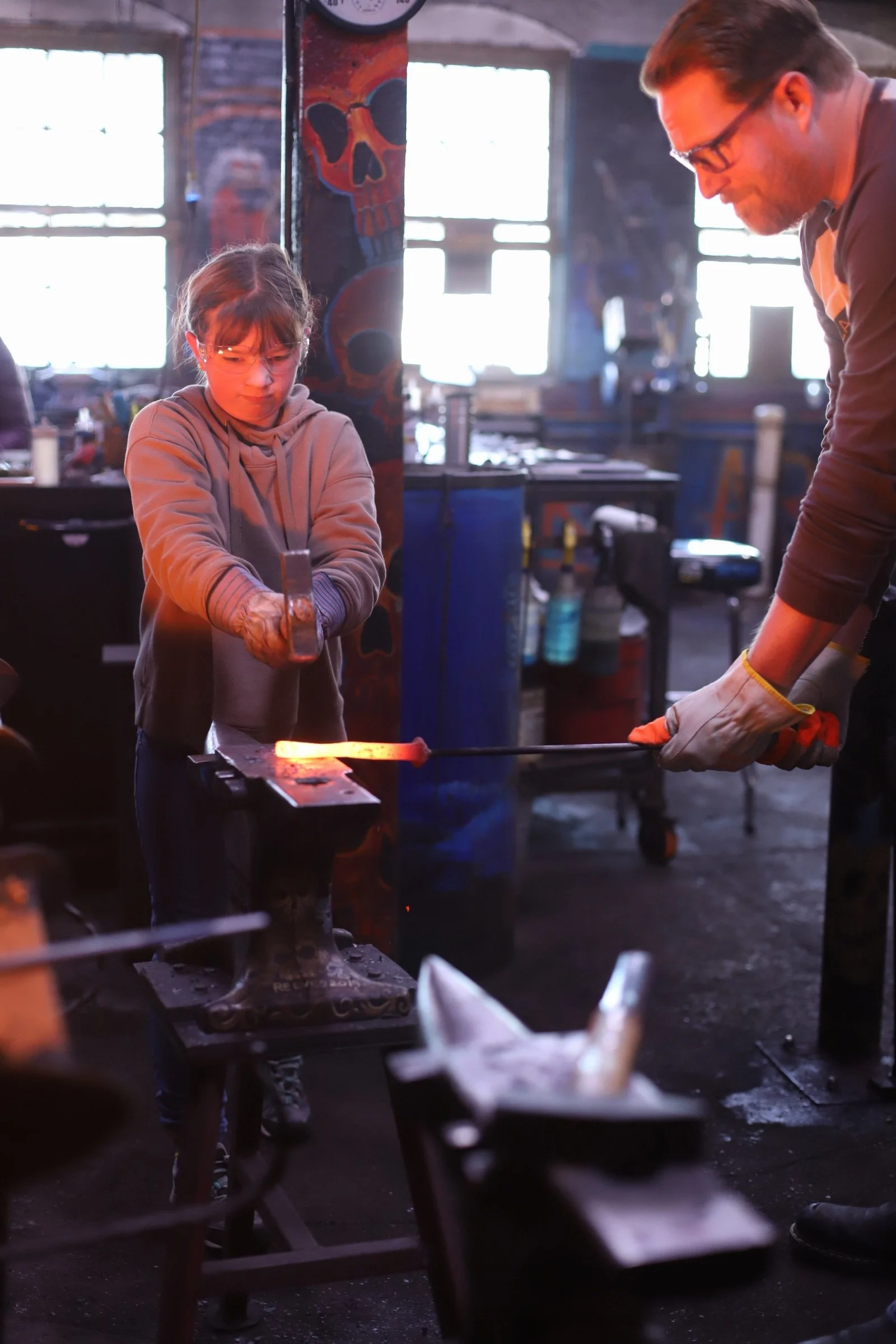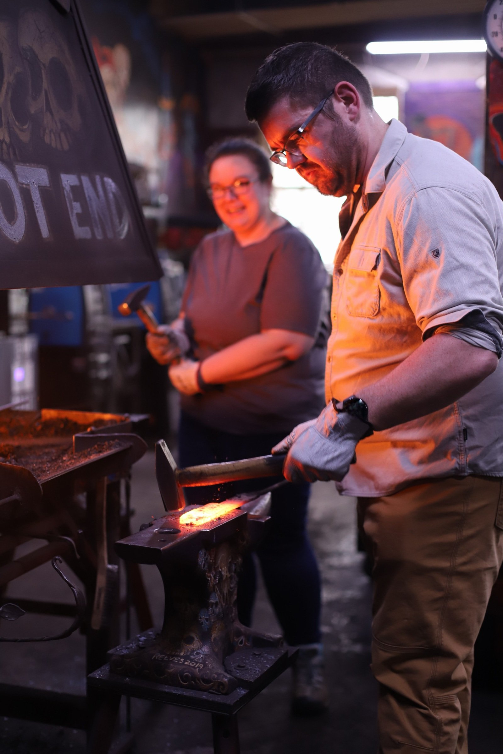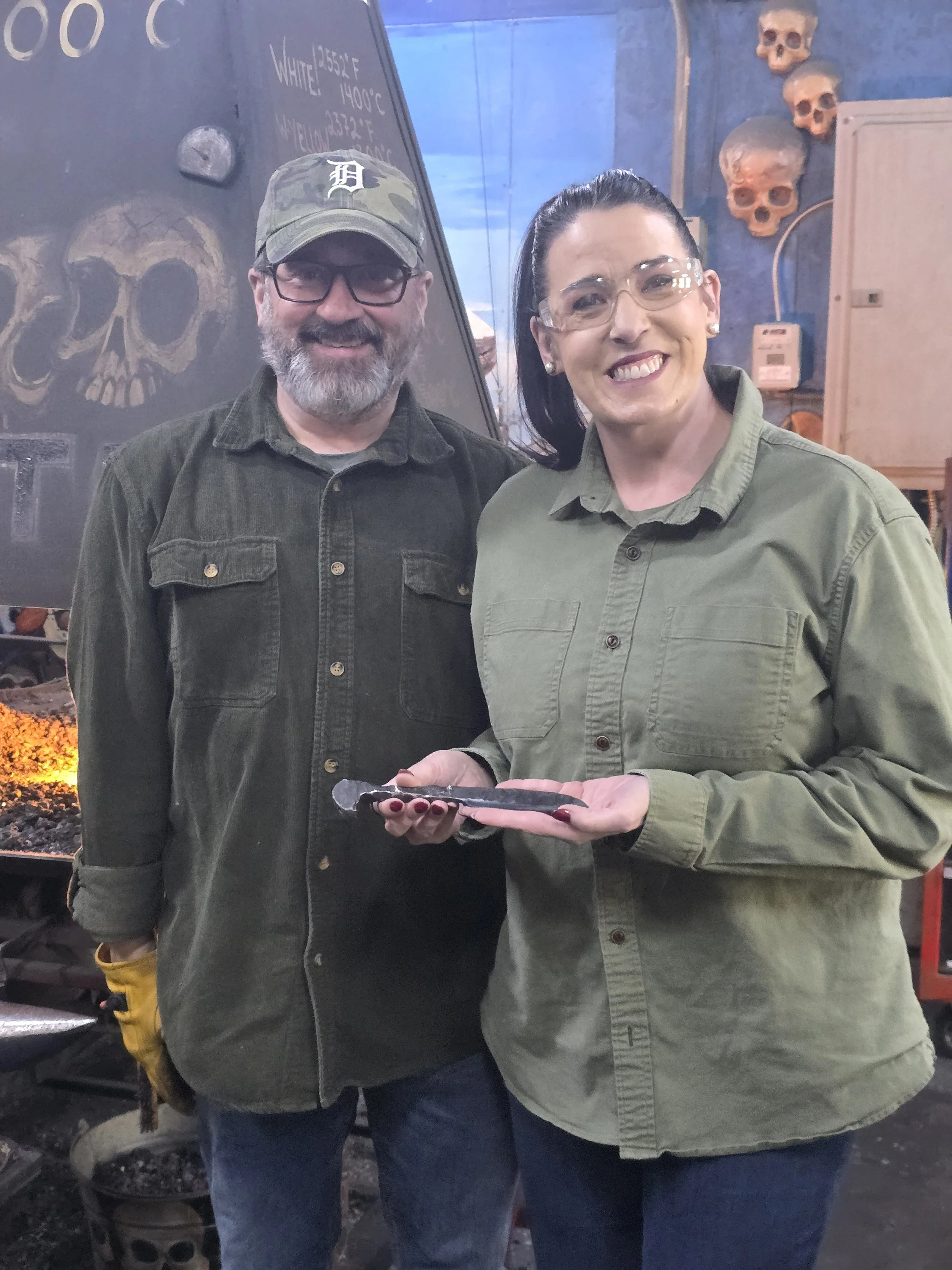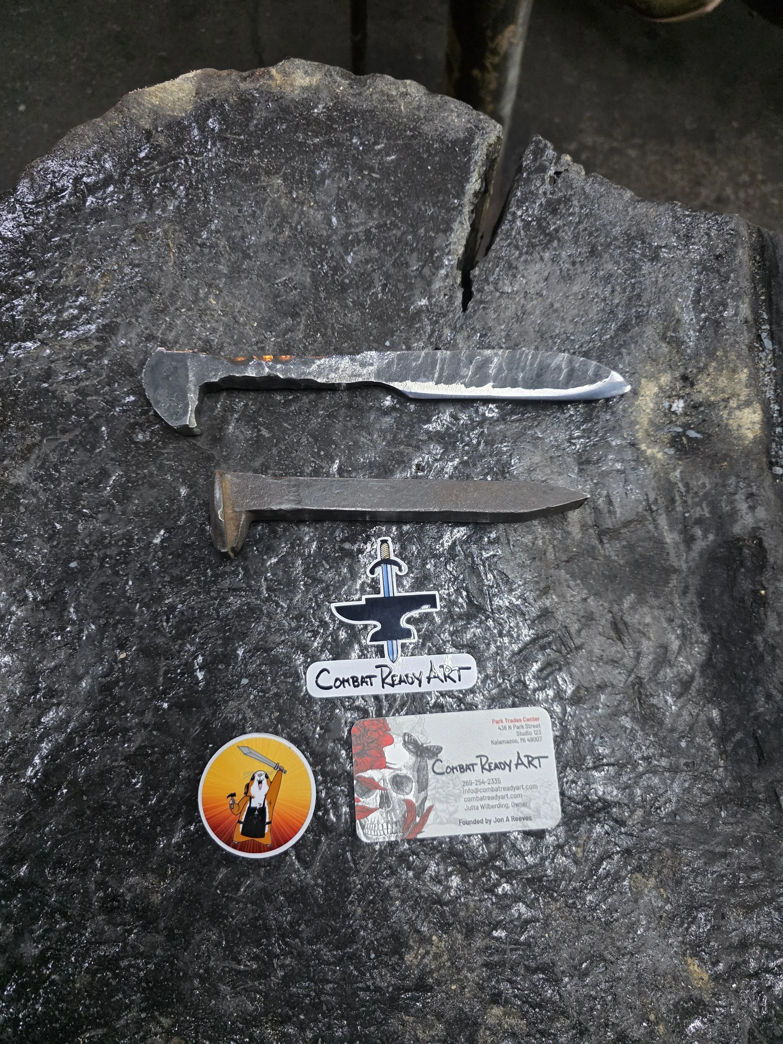 Such a fun class with these two! This was her first time in the forge, and she made a beautiful Railroad Spike Knife! He started a railroad spike dagger, and is adding handle scales next time. Great afternoon with them!