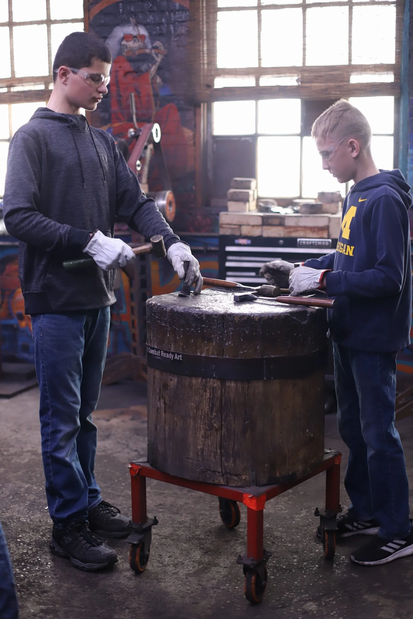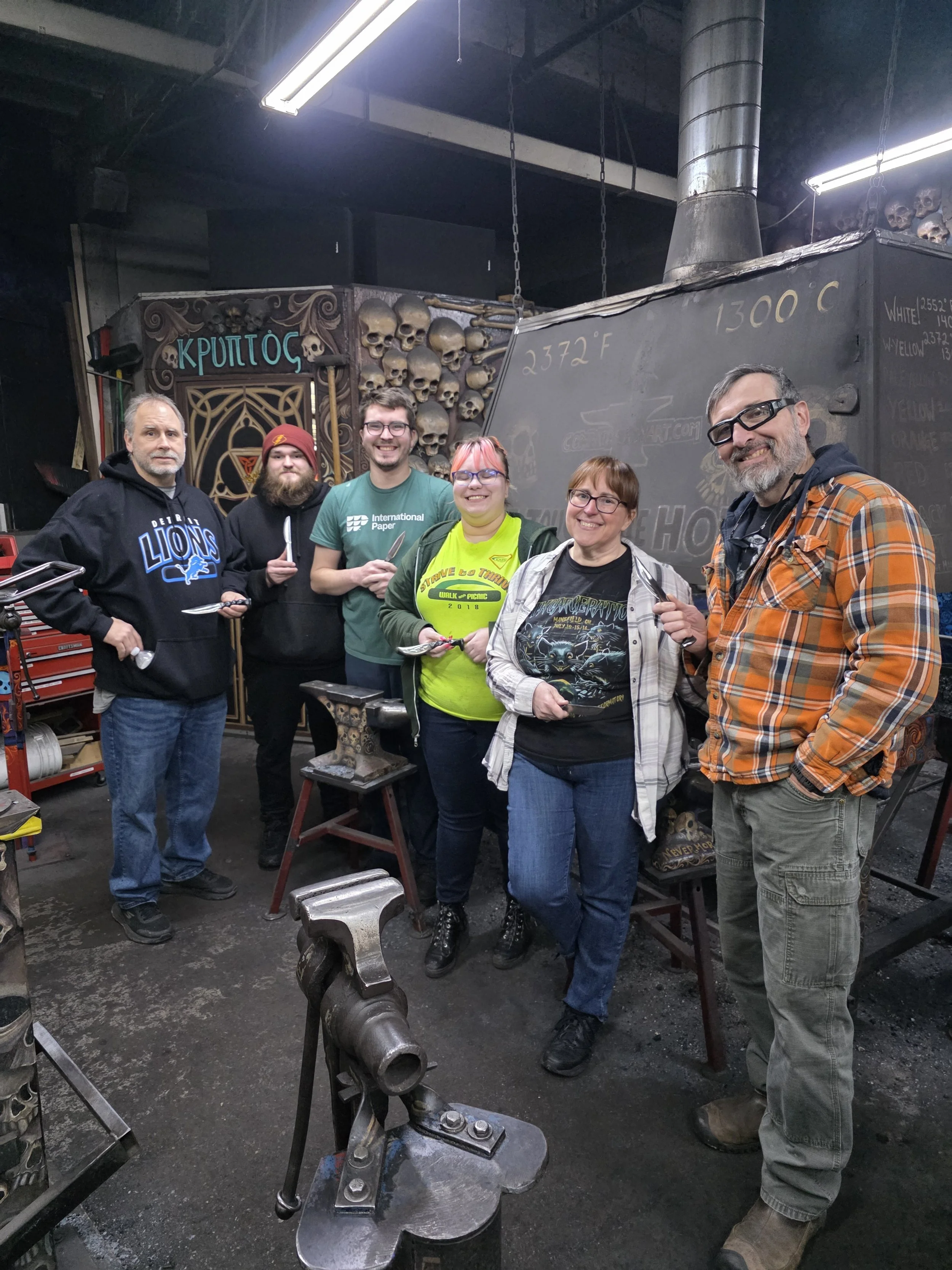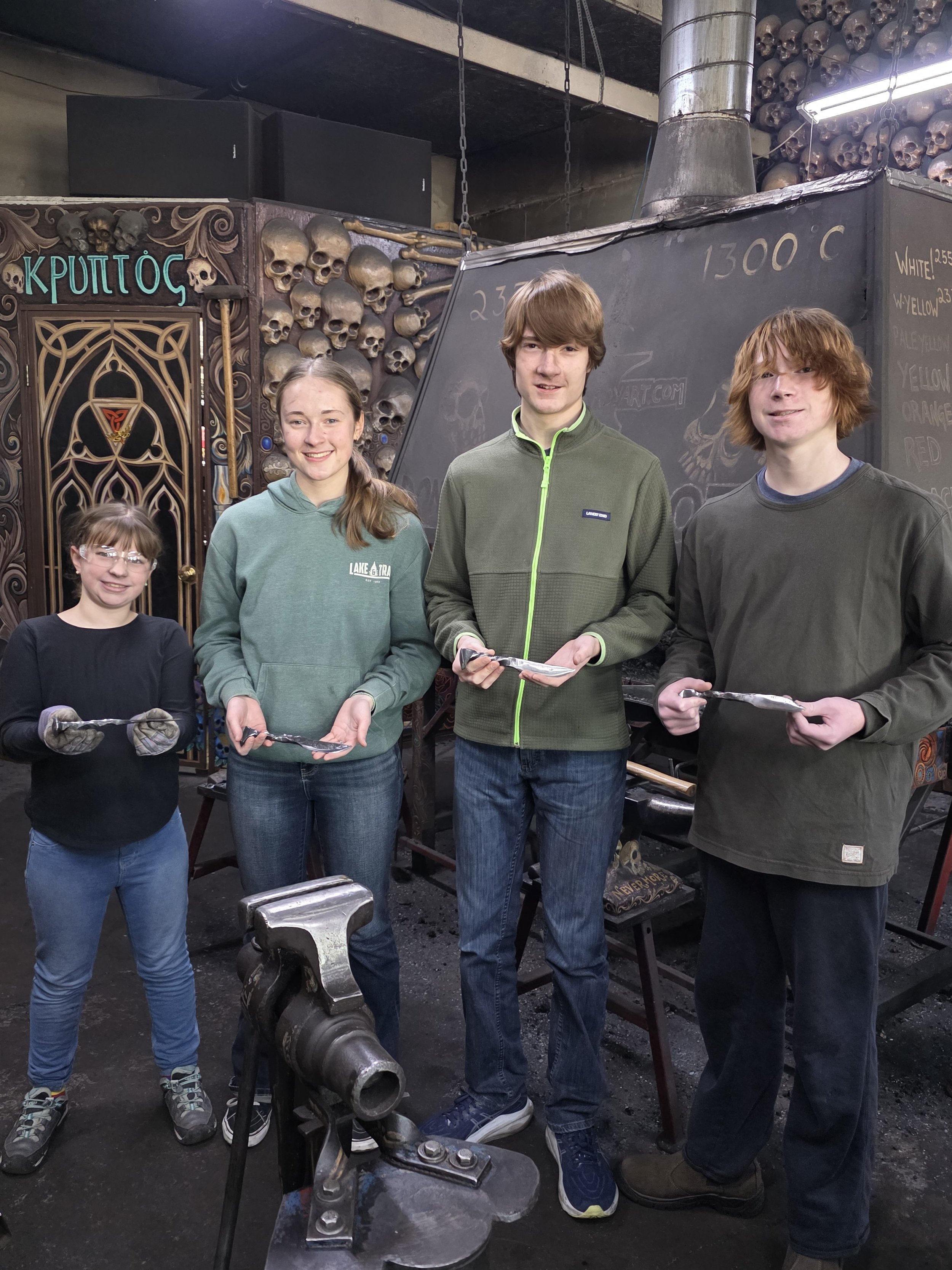 Very fun class with these 2 pairs of siblings! They were given a class as a Christmas gift. They, and their parents, came from the east side of the state to make Railroad Spike Knives. They made very nice, and very sharp, knives!