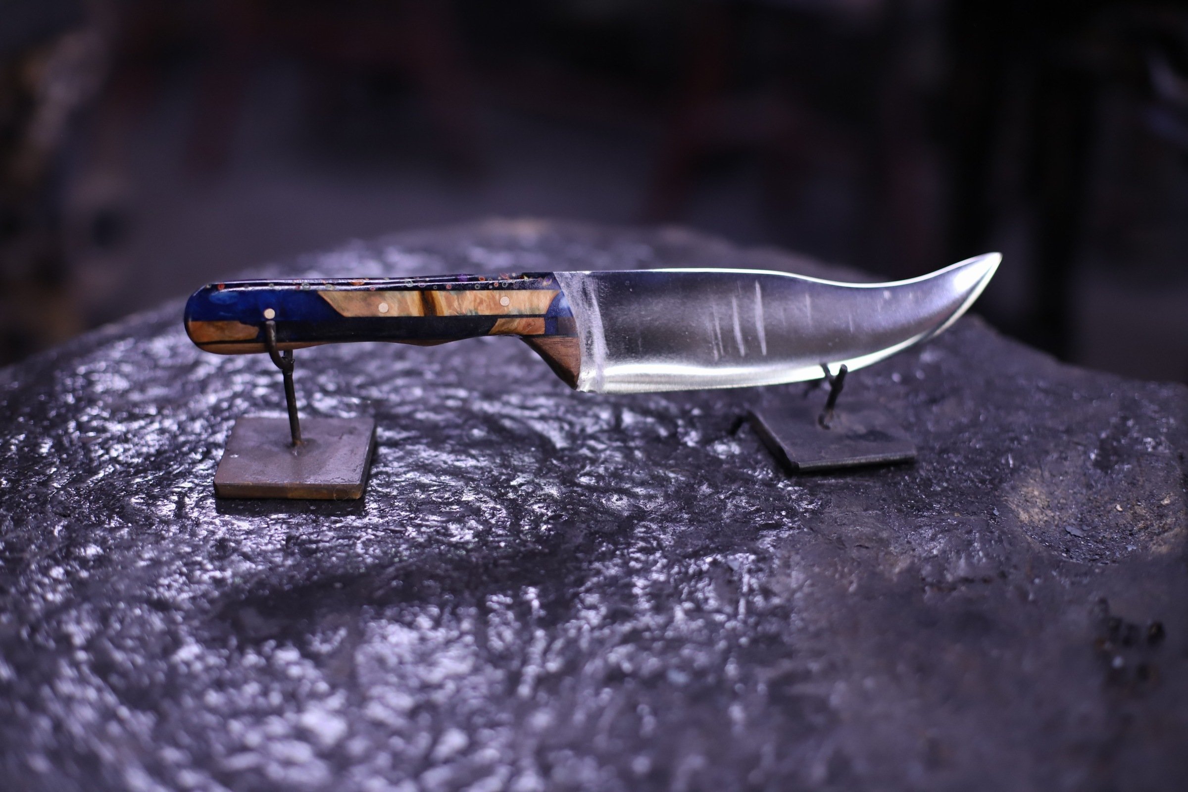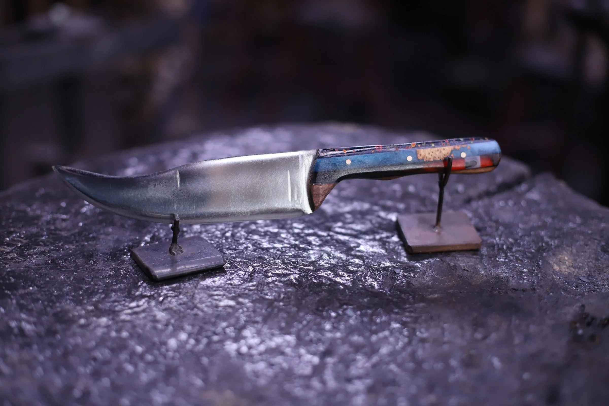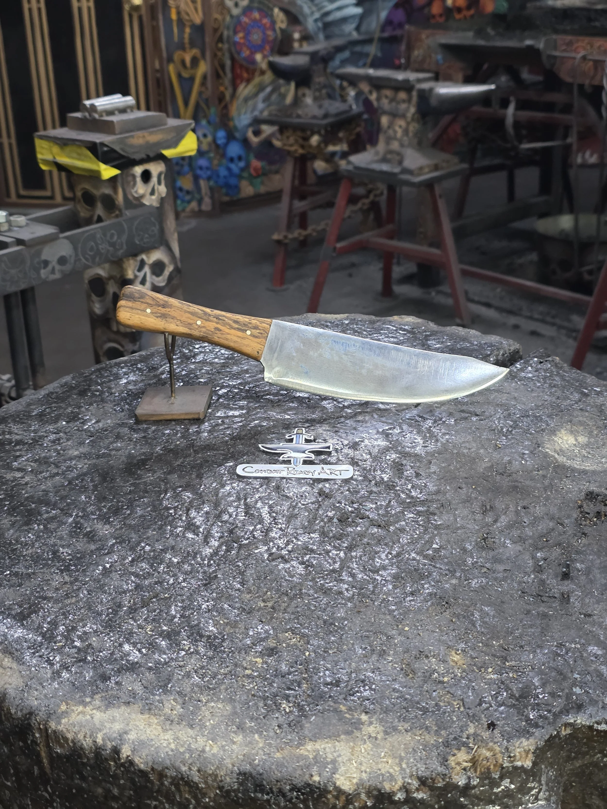 Dan was in to finish his Billet Knife and the Steel Bamboo. He's made a couple ither knives here, and this knife turned out great too! The Steel Bamboo is beautiful! He added some texture to the stalks, and brought some wood for the mount. Really beautiful!