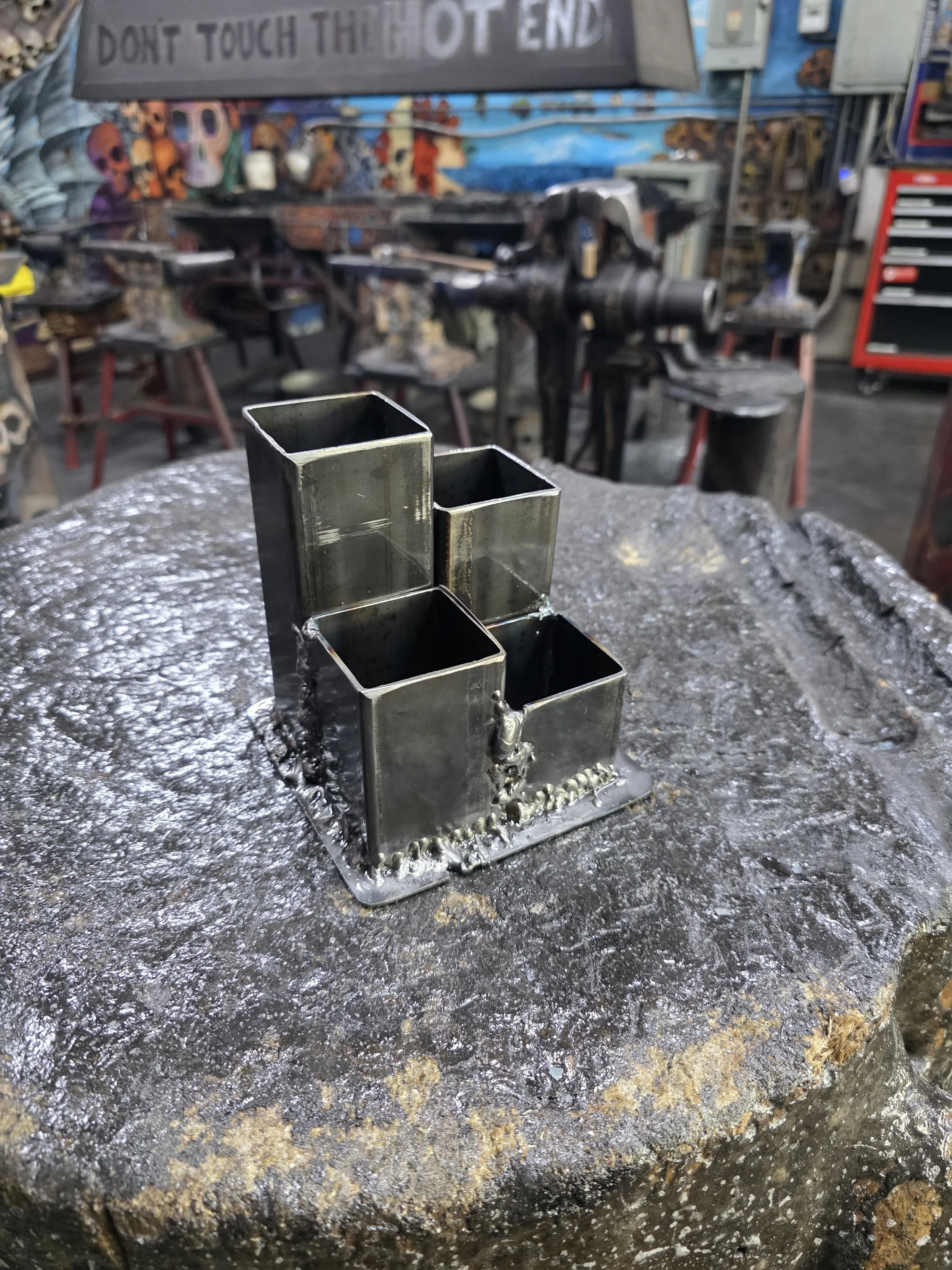 Rick was back today to learn welding! He went for the classic square design of the pencil holder.