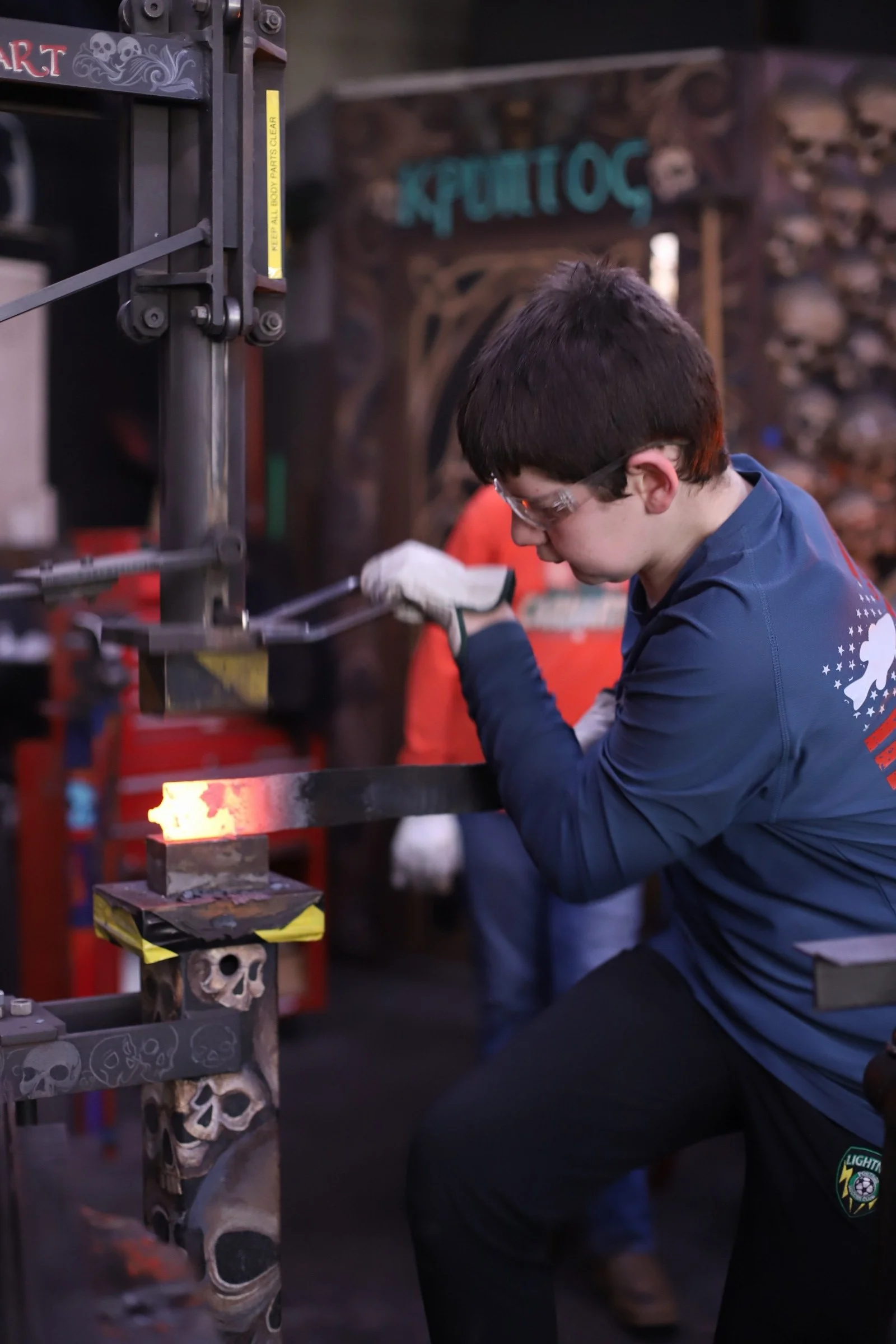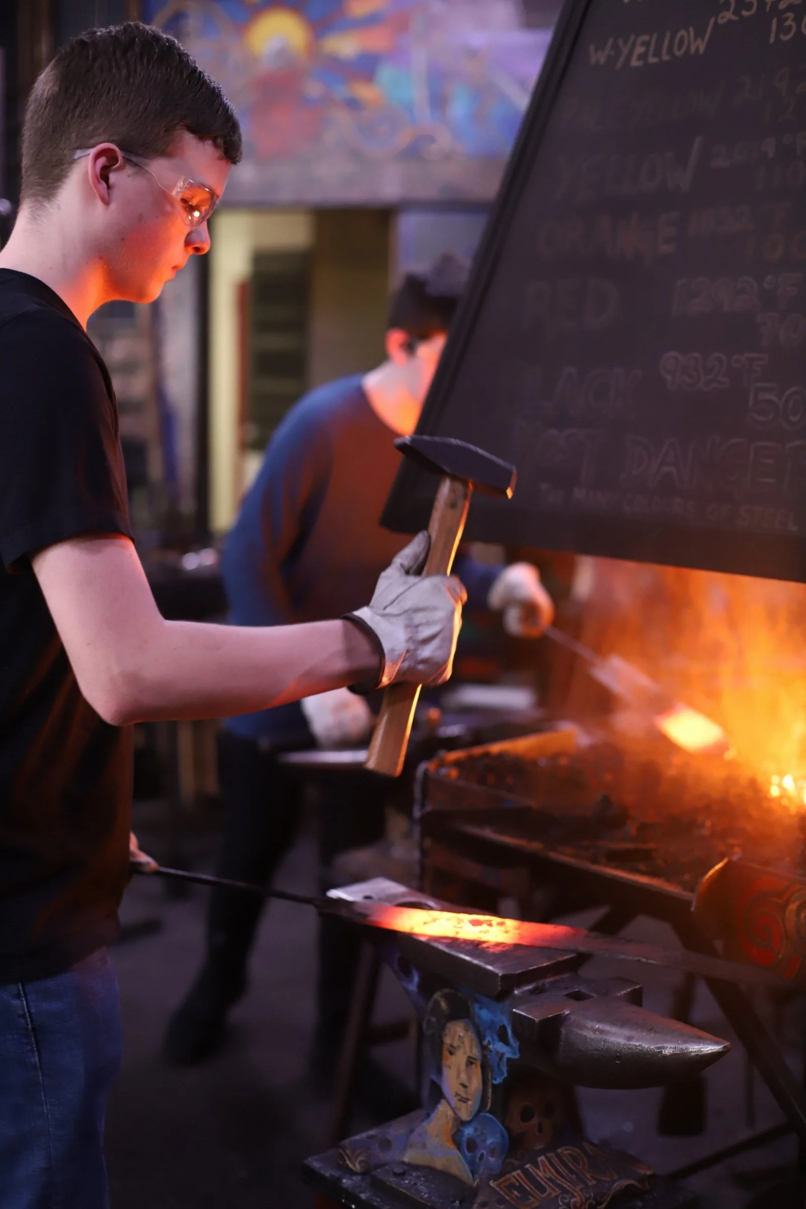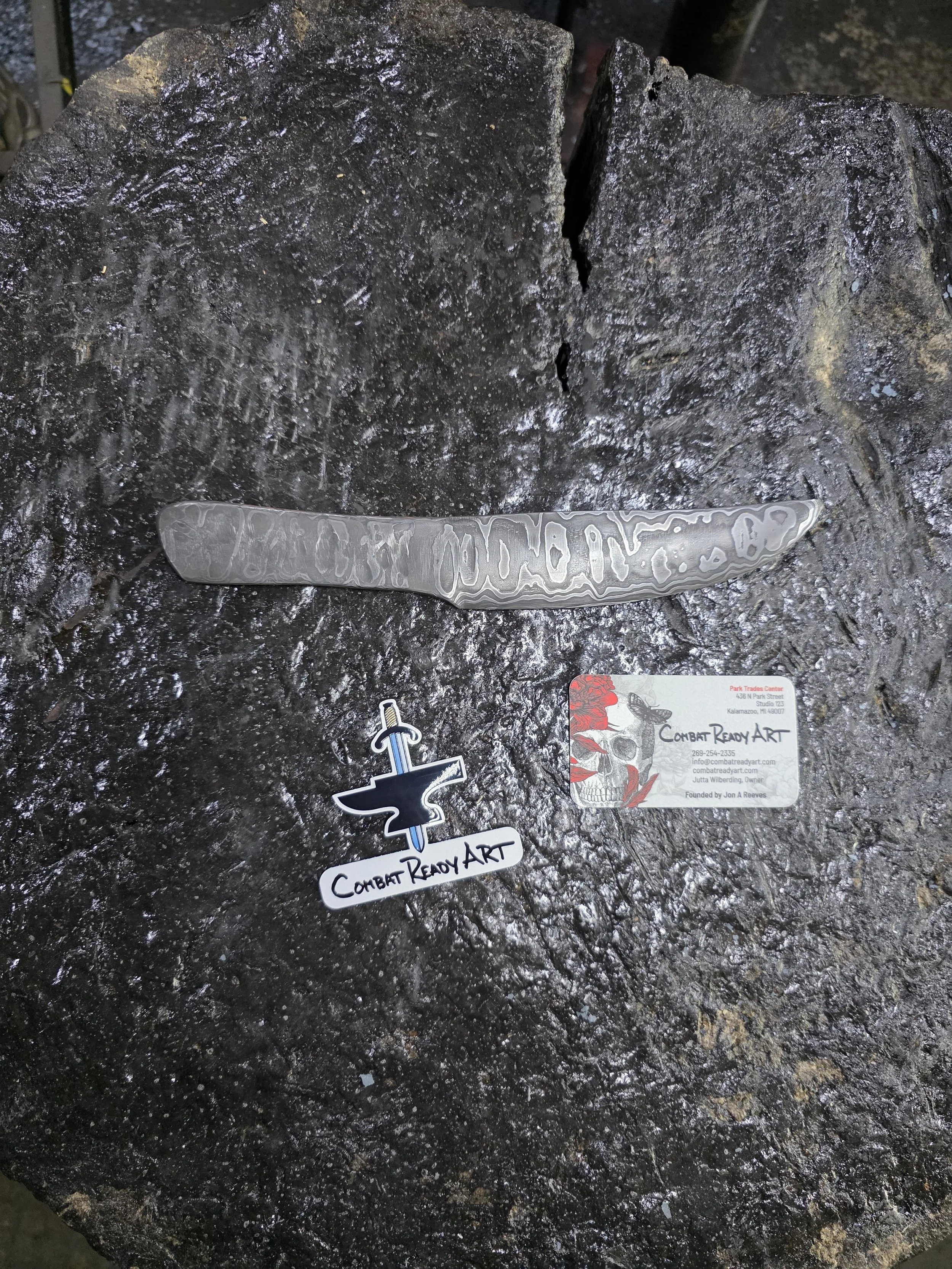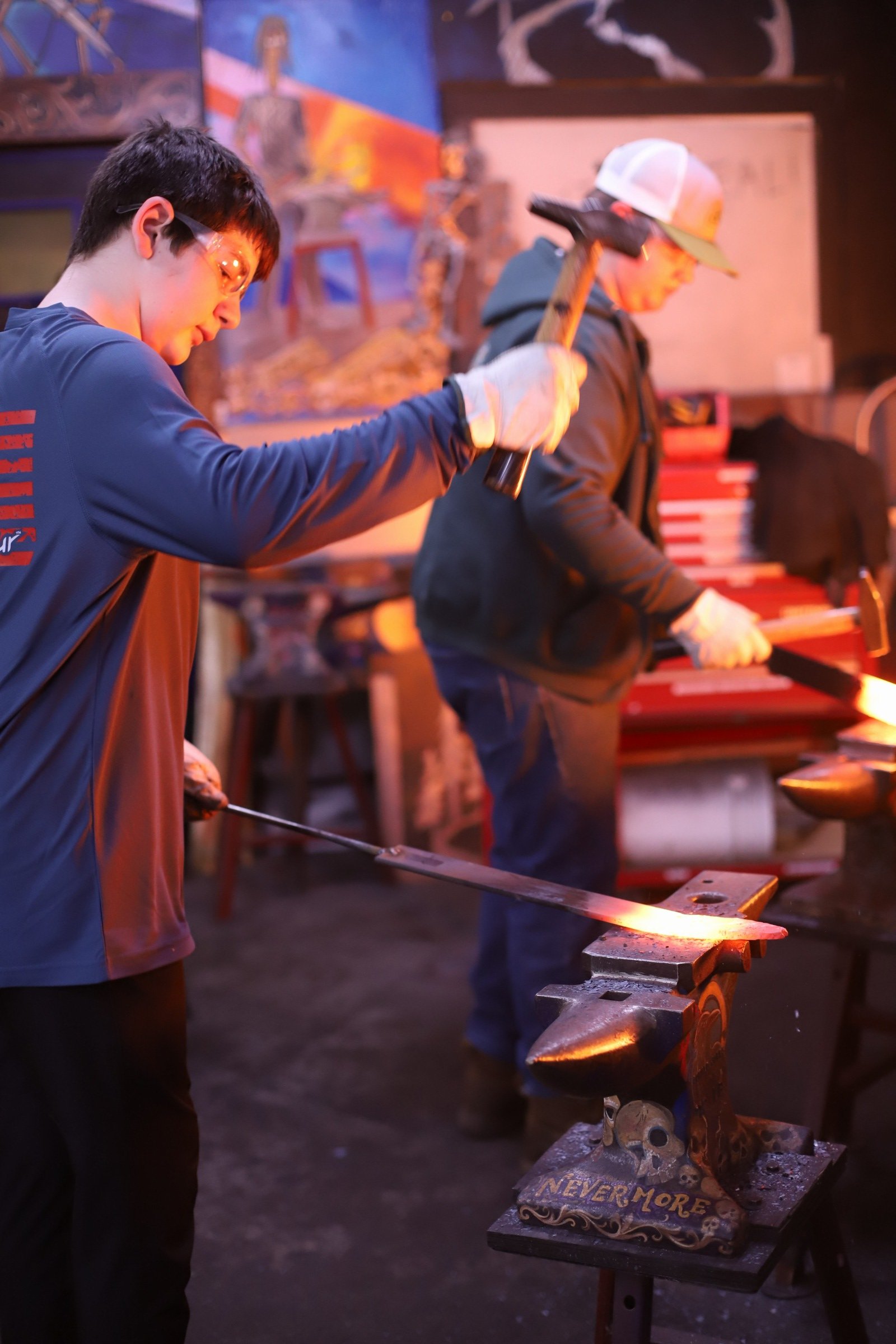 Because of the snow day last week, both age groups for Level 2 Homeschool class were in the forge this morning! Everyone is at different stages in their projects. Elijah finished his first damascus knife, and then started his short sword. Cruz is almost done with his damascus. He got a fantastic pattern on the blade! Landon started his short sword. Both he and Elijah will be grinding next time. And Ben finished hammering his sword, cleaned it up on the grinder, and is almost done with the cutting edge. Really nice work by him today!