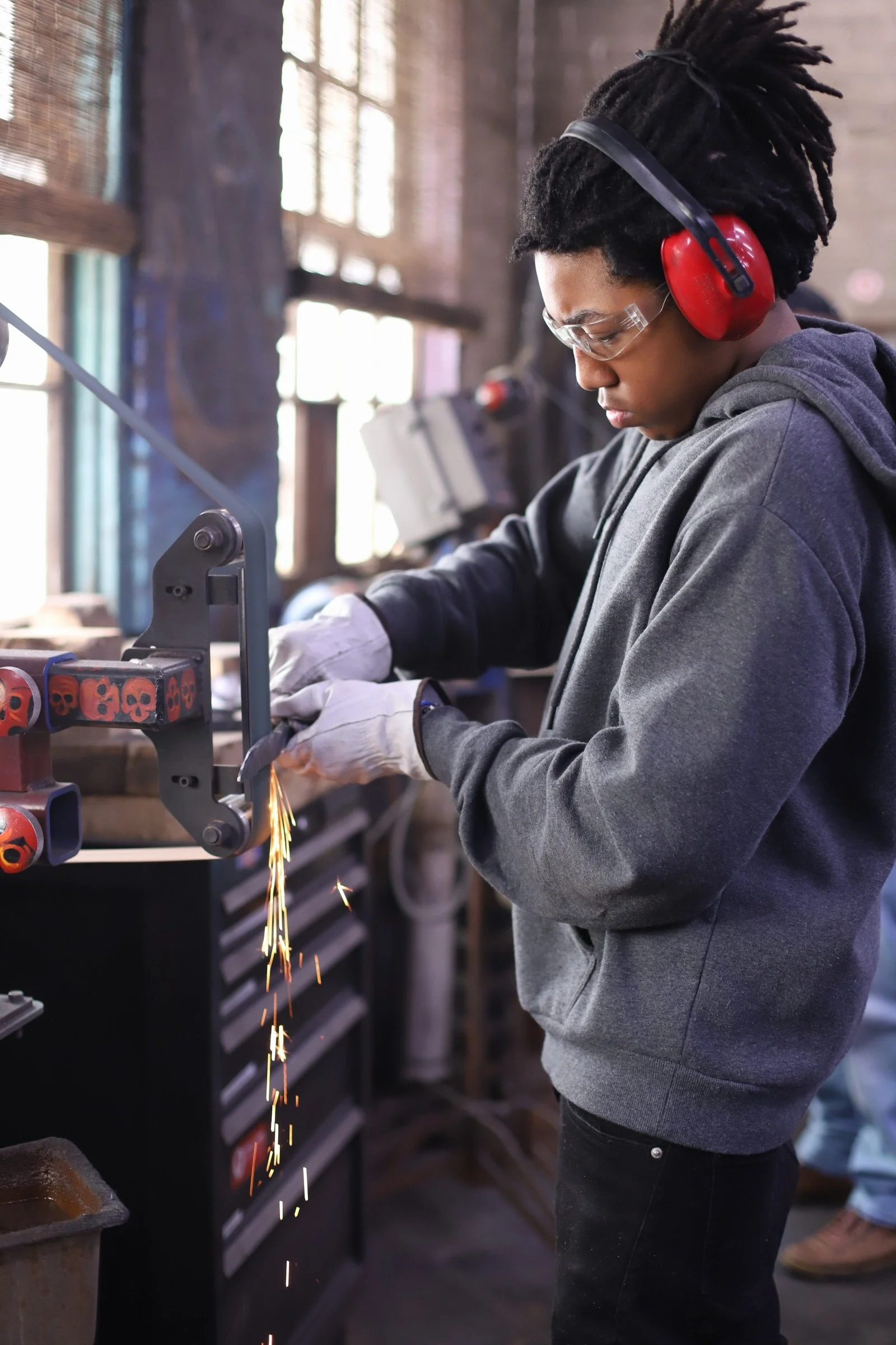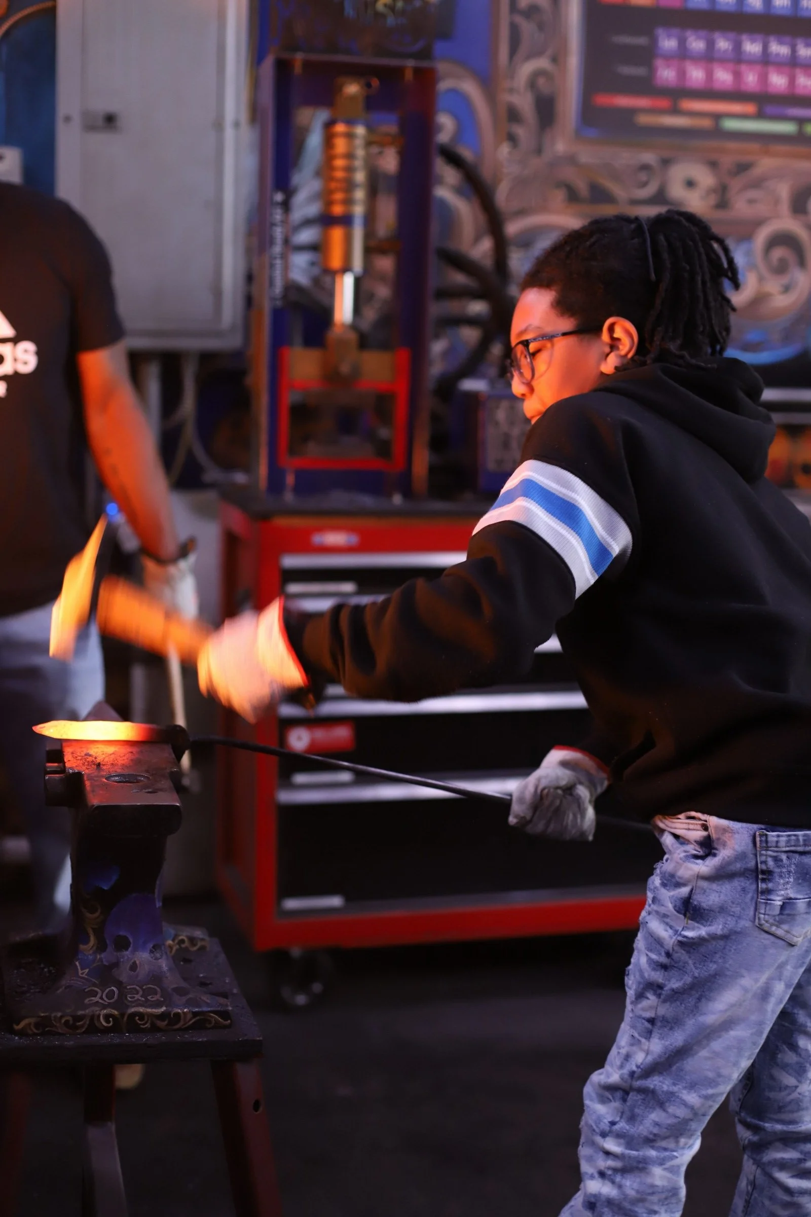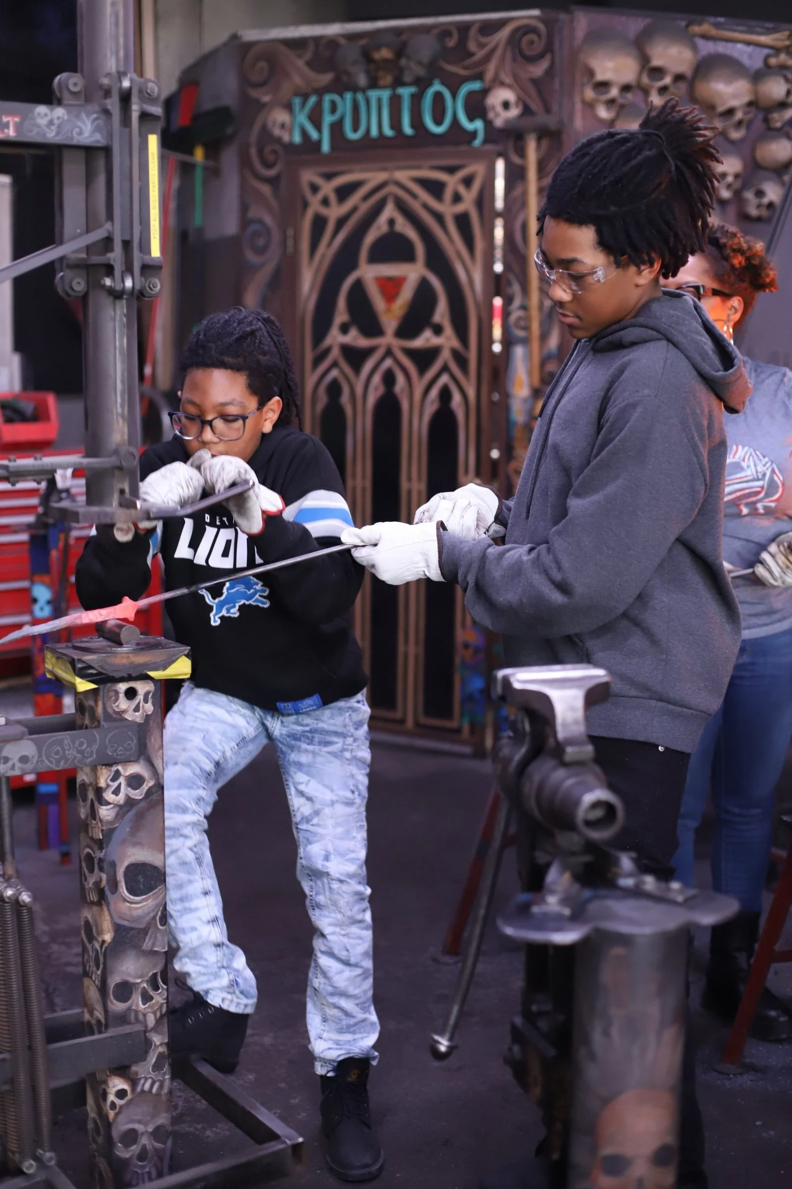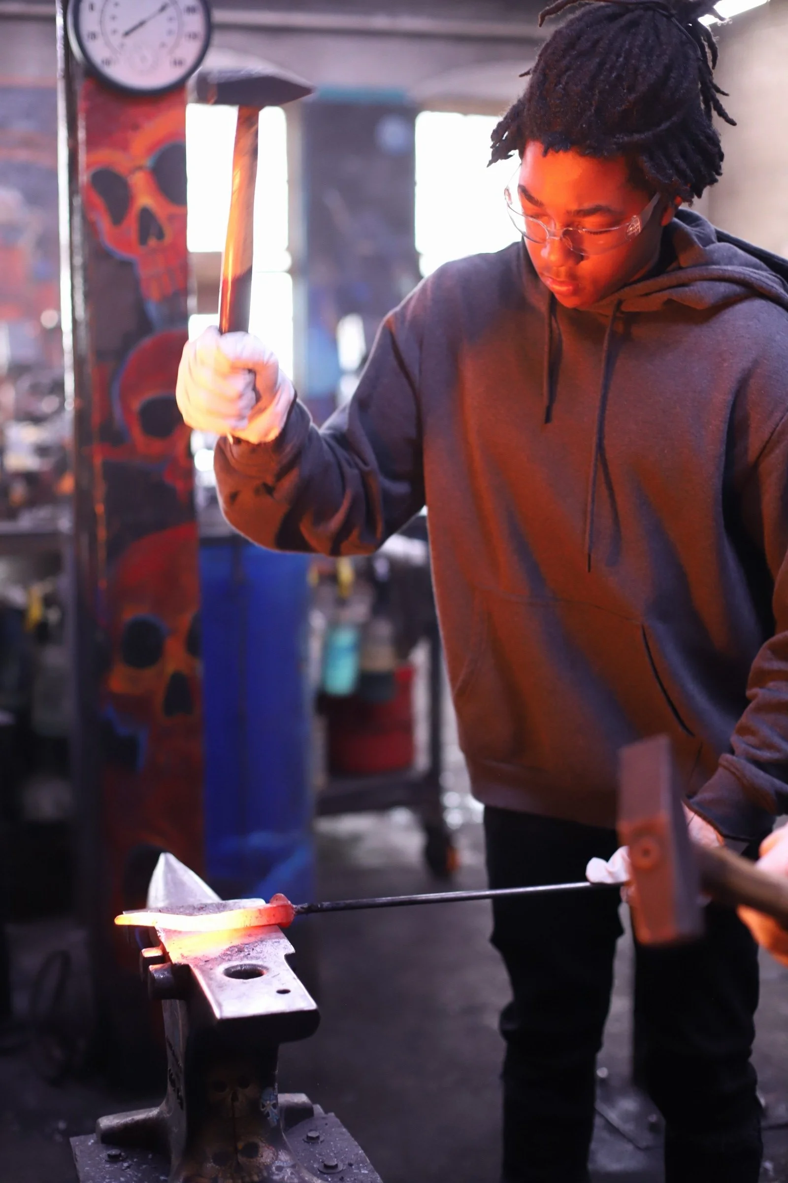 Because of the snow day last week, both age groups for Level 2 Homeschool class were in the forge this morning! Everyone is at different stages in their projects. Elijah finished his first damascus knife, and then started his short sword. Cruz is almost done with his damascus. He got a fantastic pattern on the blade! Landon started his short sword. Both he and Elijah will be grinding next time. And Ben finished hammering his sword, cleaned it up on the grinder, and is almost done with the cutting edge. Really nice work by him today!