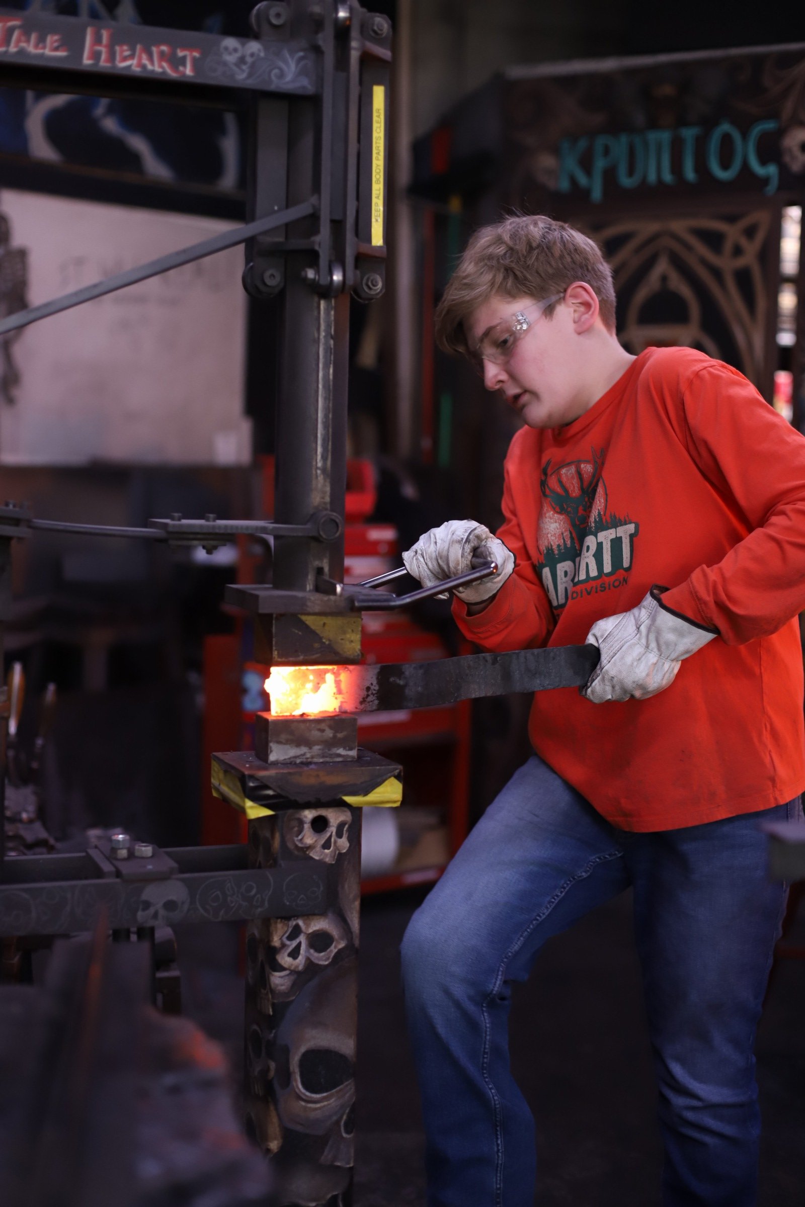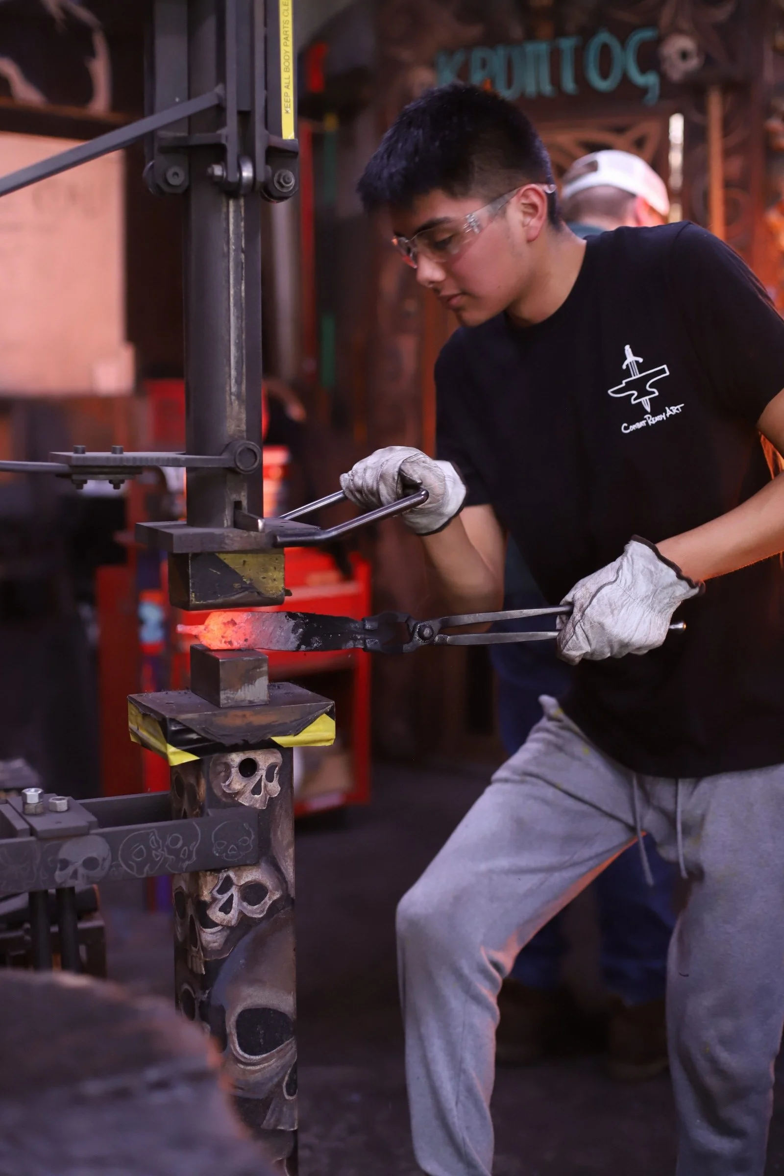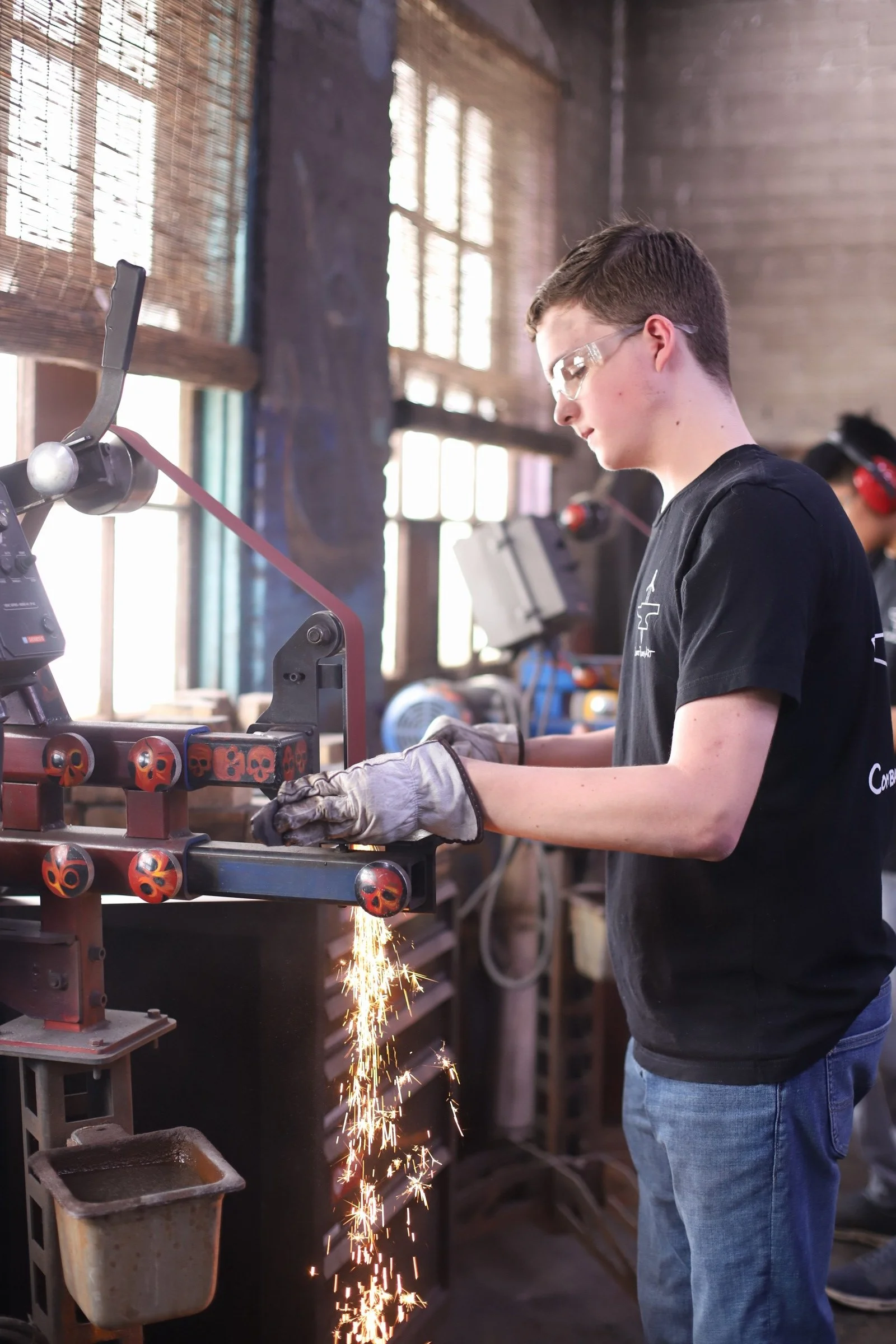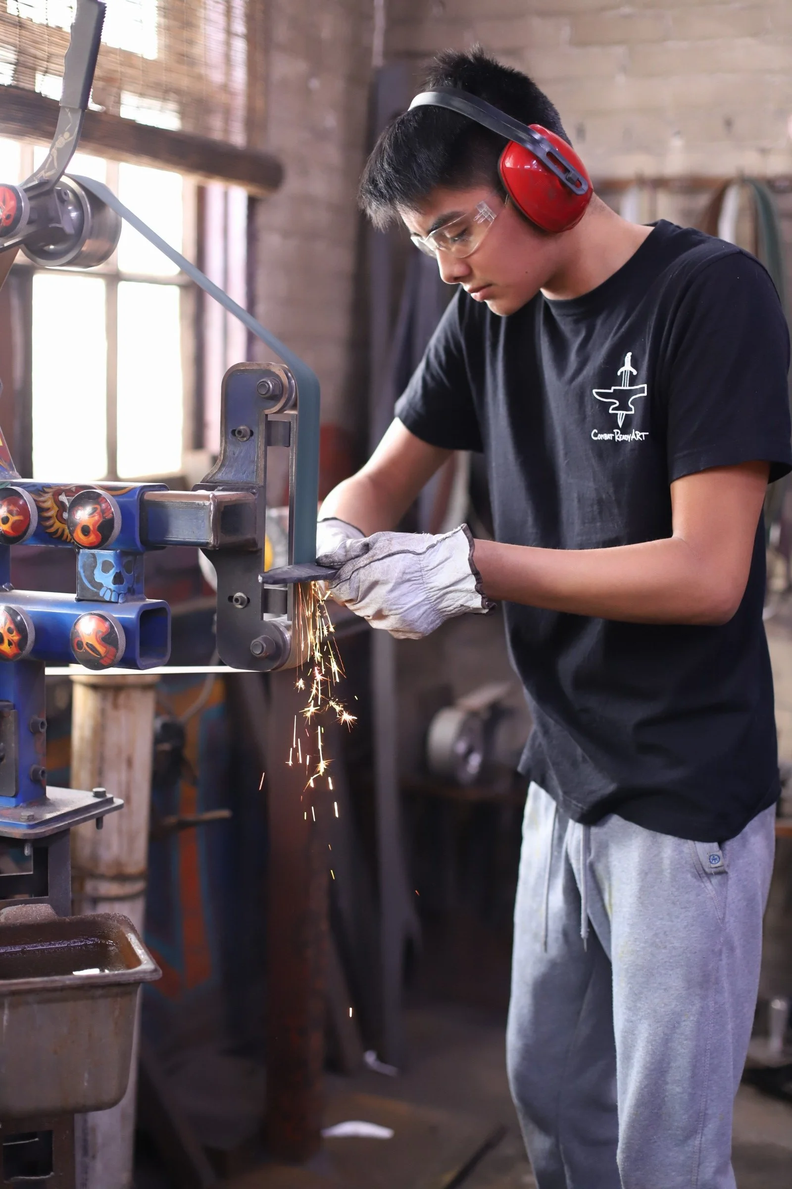 Because of the snow day last week, both age groups for Level 2 Homeschool class were in the forge this morning! Everyone is at different stages in their projects. Elijah finished his first damascus knife, and then started his short sword. Cruz is almost done with his damascus. He got a fantastic pattern on the blade! Landon started his short sword. Both he and Elijah will be grinding next time. And Ben finished hammering his sword, cleaned it up on the grinder, and is almost done with the cutting edge. Really nice work by him today!