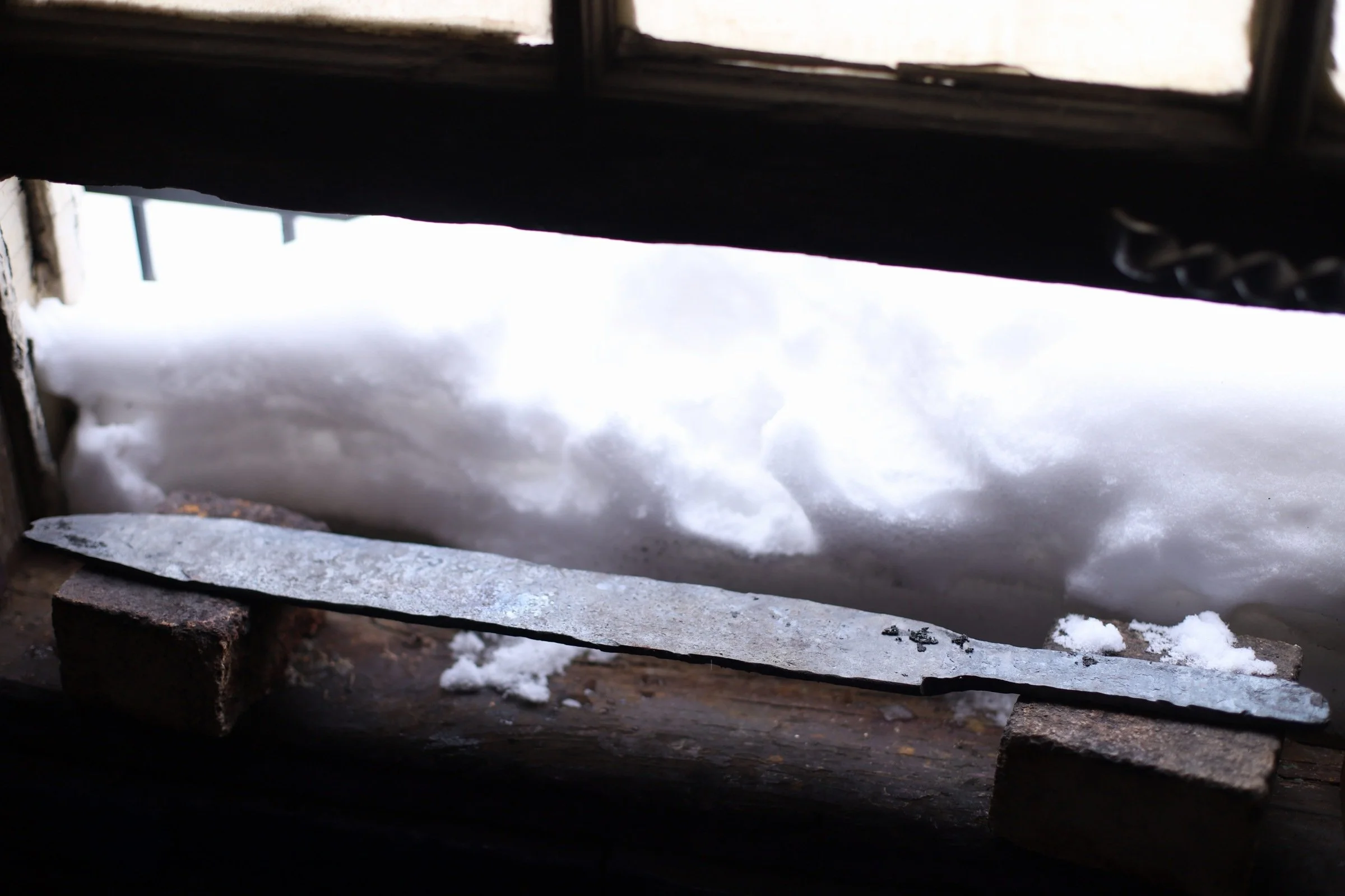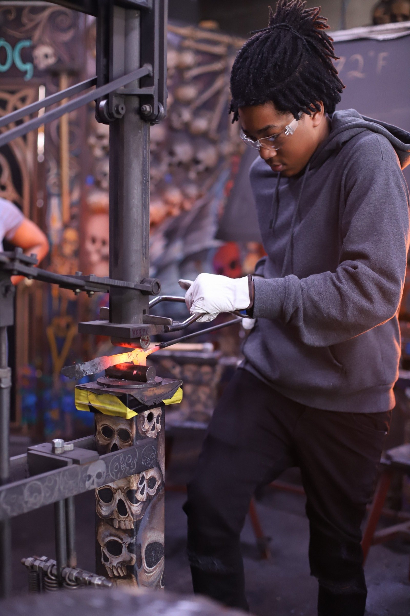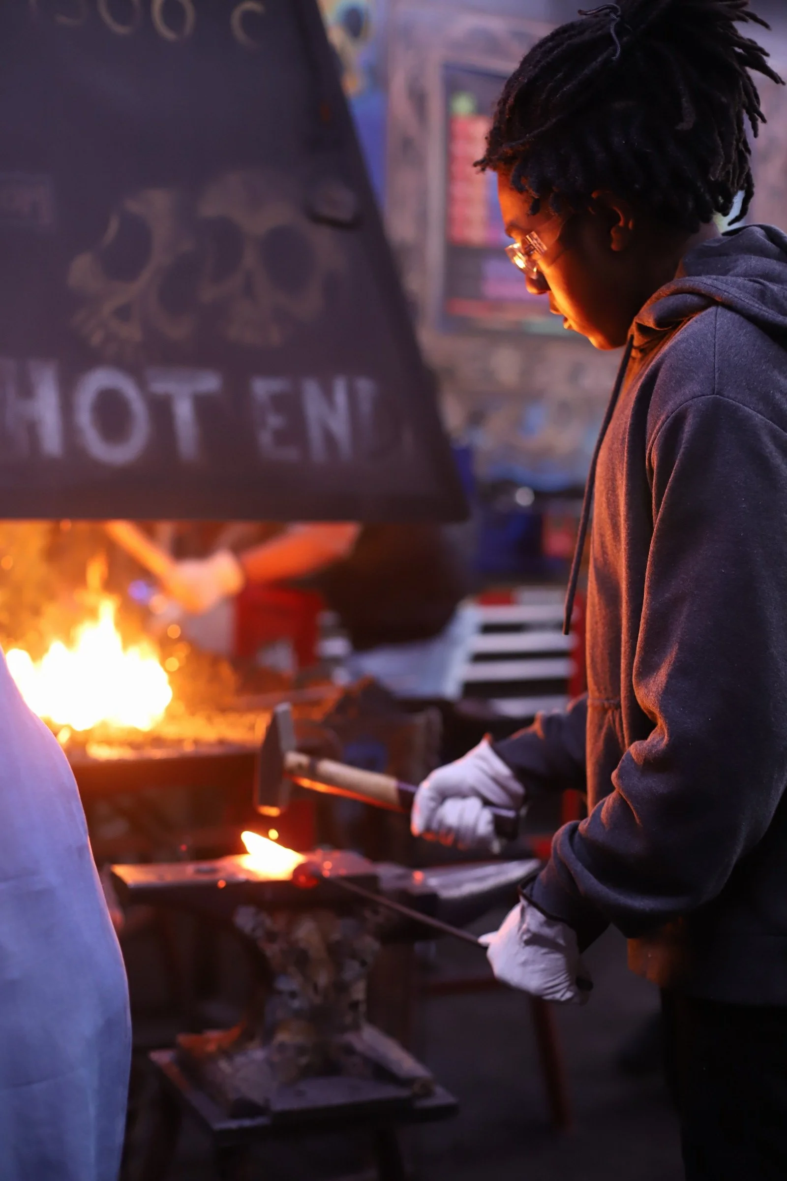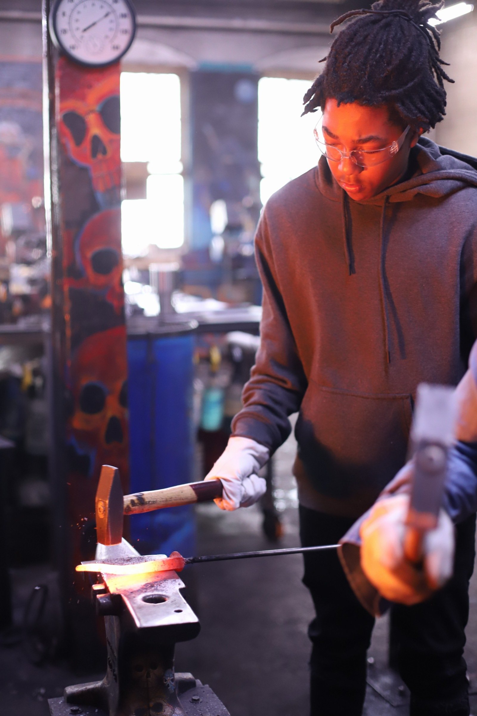 Because of the snow day last week, both age groups for Level 2 Homeschool class were in the forge this morning! Everyone is at different stages in their projects. Elijah finished his first damascus knife, and then started his short sword. Cruz is almost done with his damascus. He got a fantastic pattern on the blade! Landon started his short sword. Both he and Elijah will be grinding next time. And Ben finished hammering his sword, cleaned it up on the grinder, and is almost done with the cutting edge. Really nice work by him today!