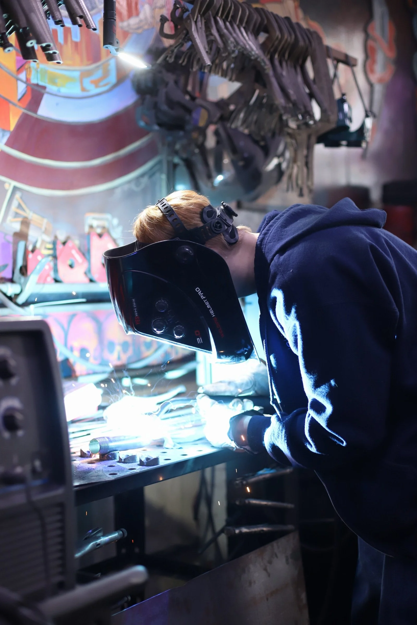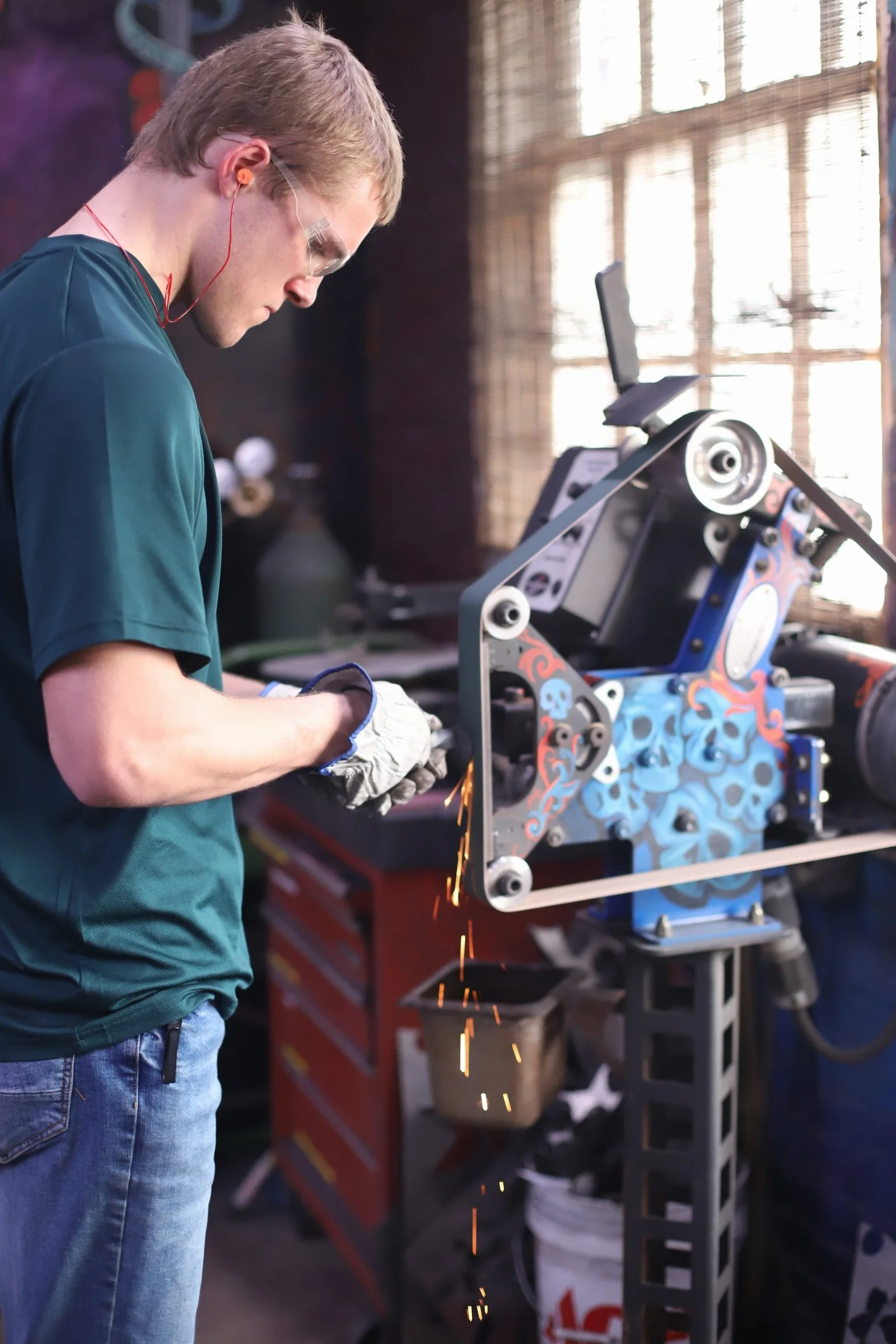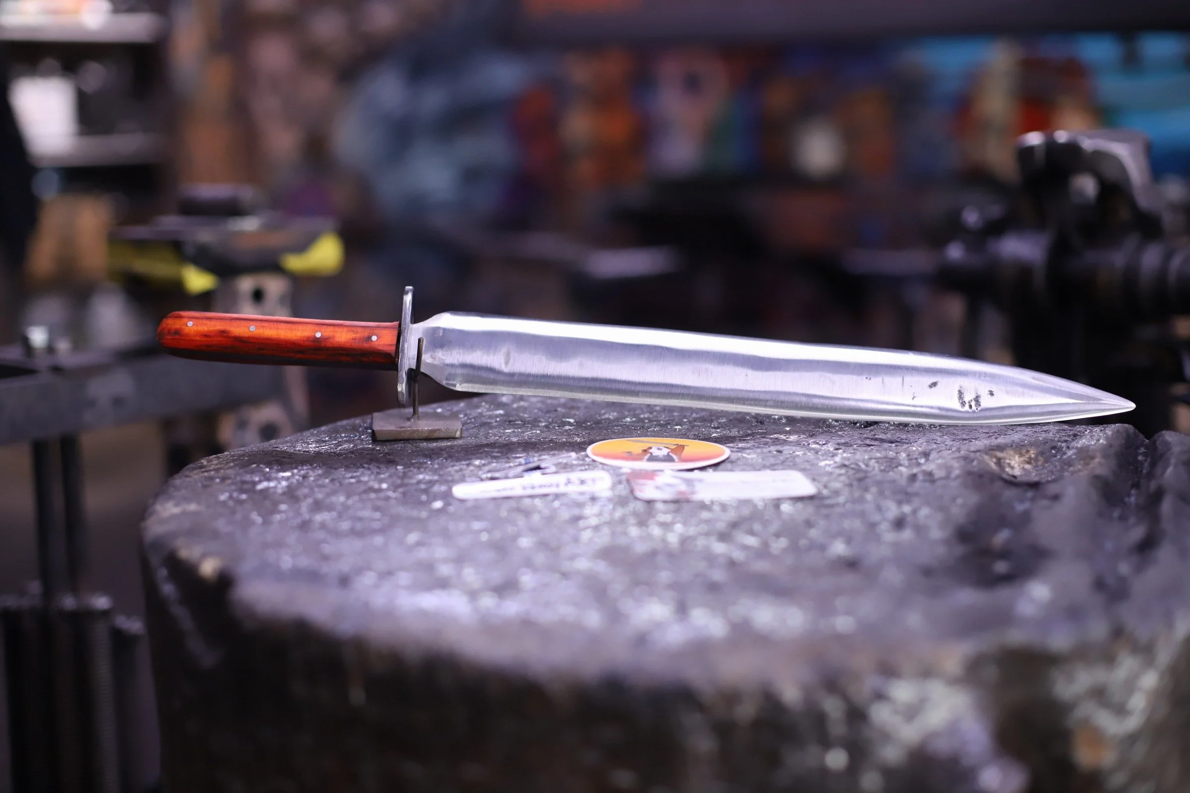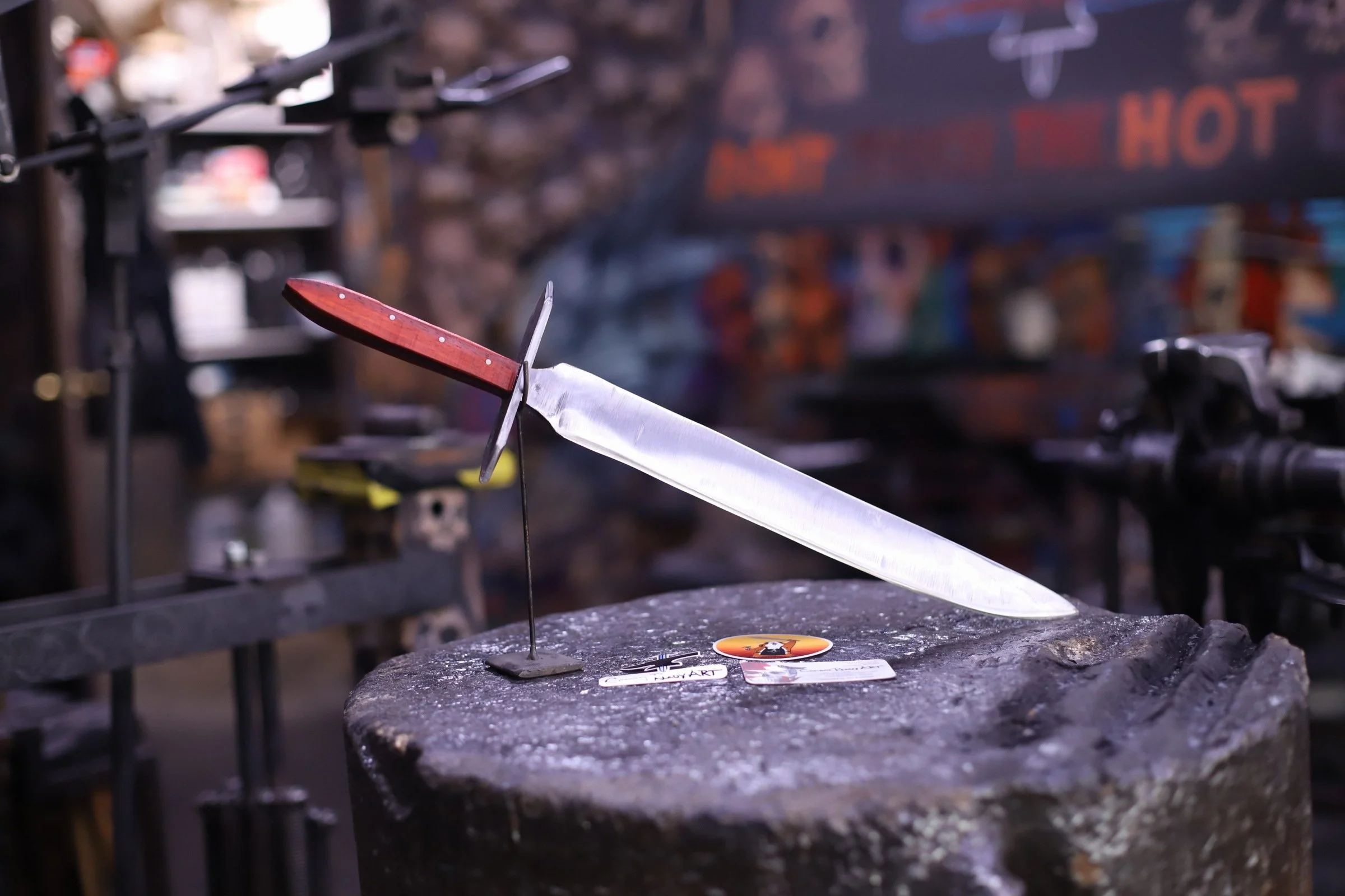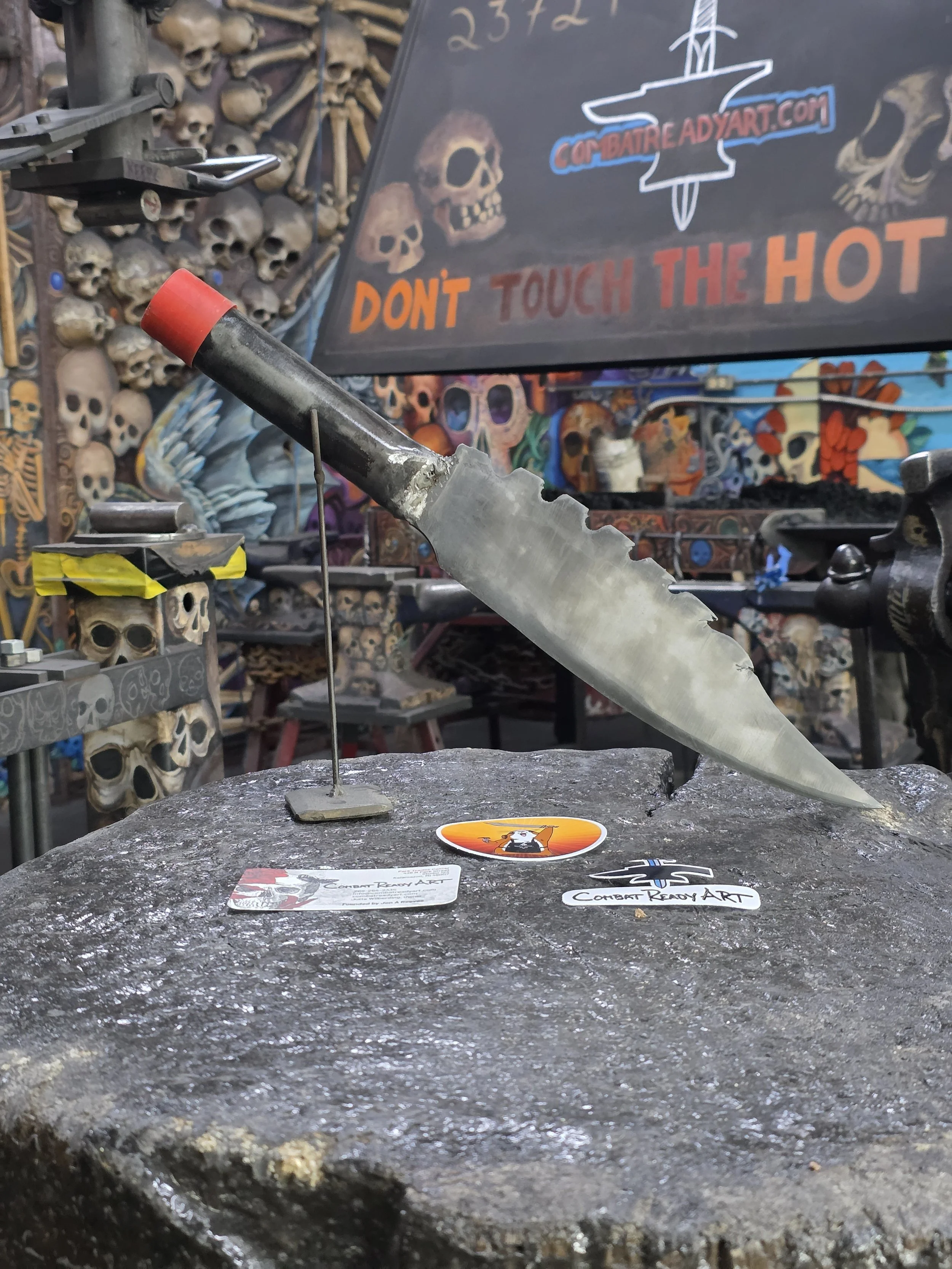 Kevin was in today to finish his Rambo-inspired Apocalypse Knife! This is a fun one! The blade is the edge of a saw blade. The handle is a pipe! There's a hidden tang, bit enough space for some survival gear. It's been welded on, and the red end cap is temporary until he gets a real cap. Very creative idea!