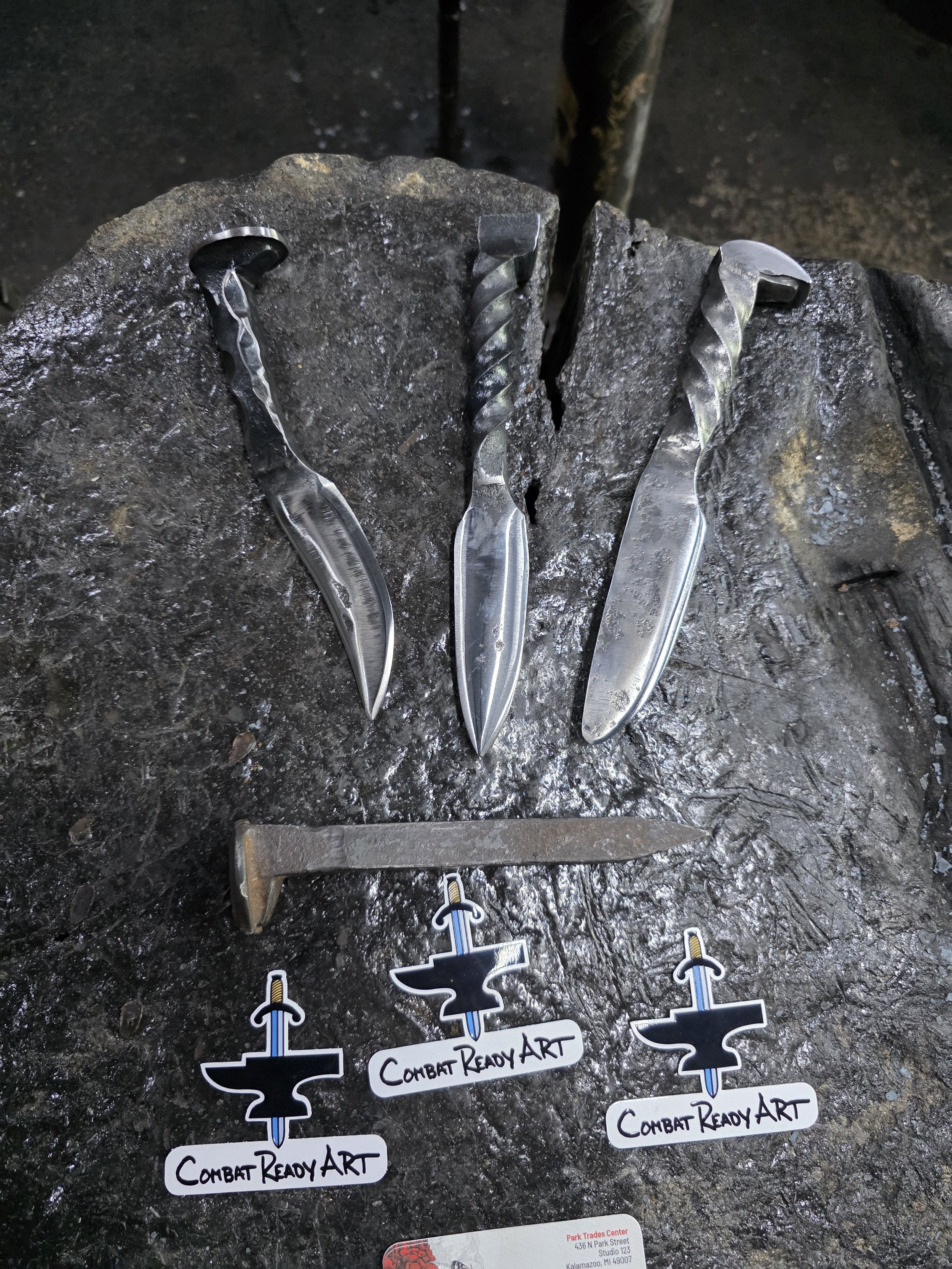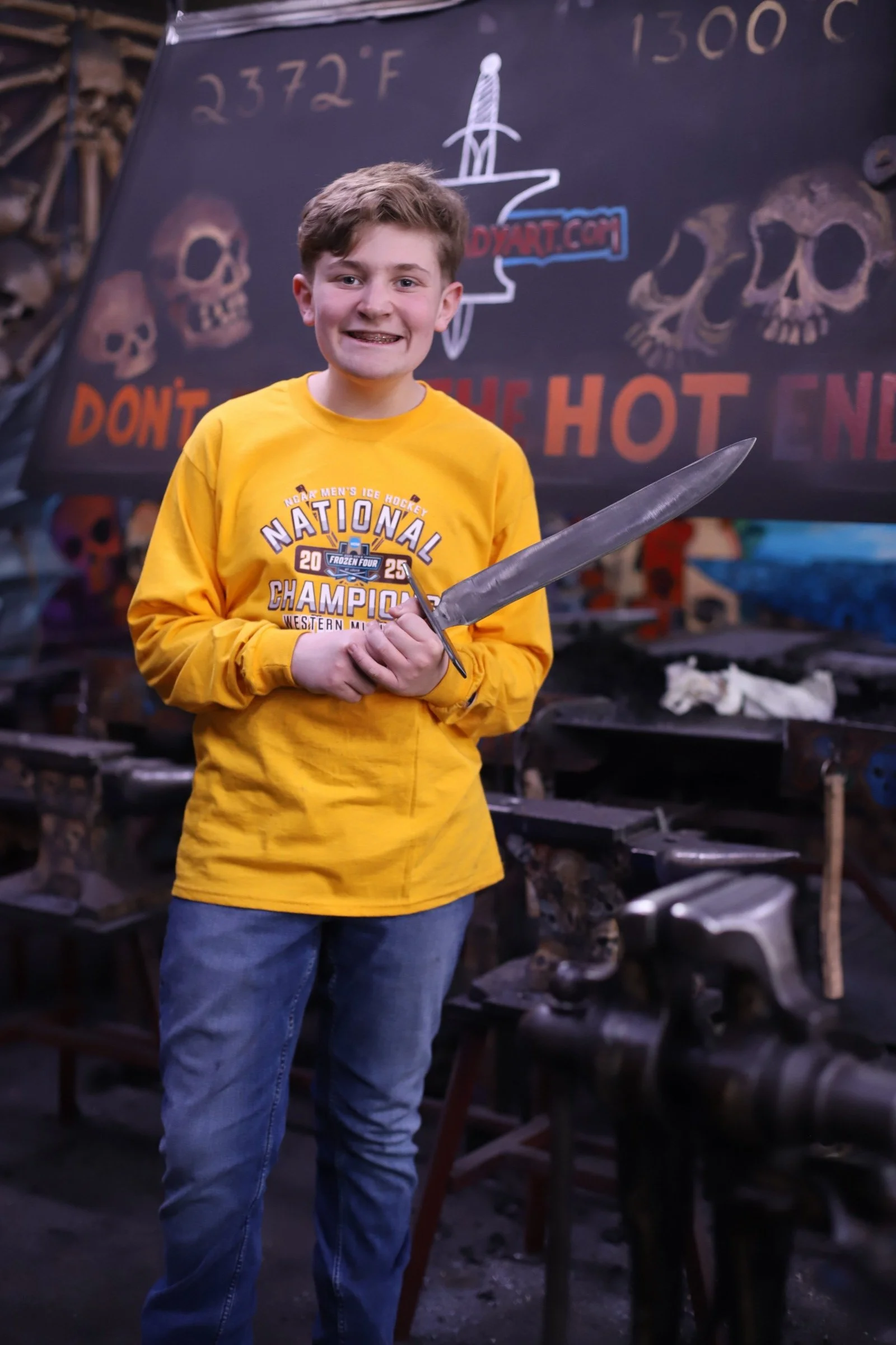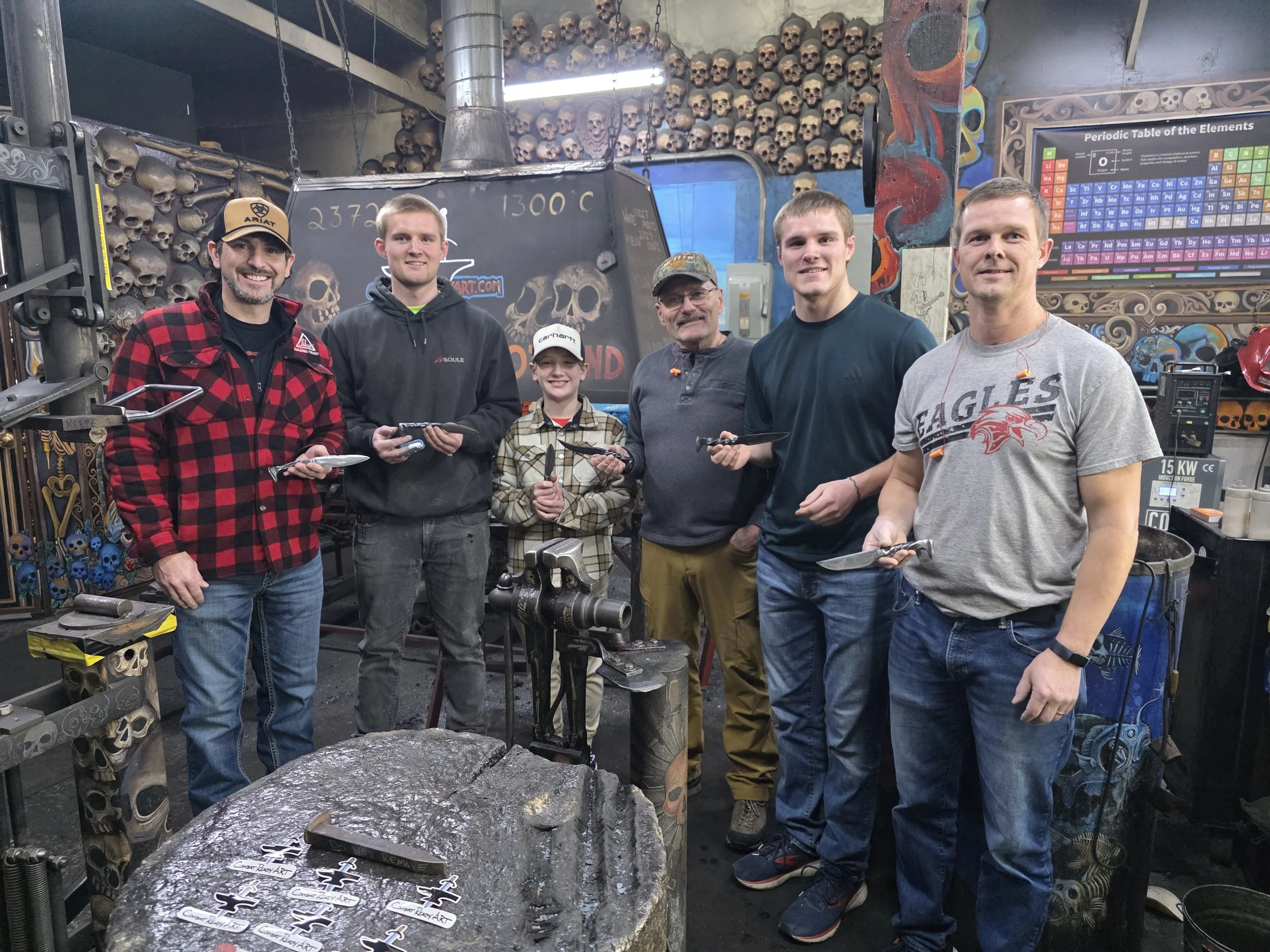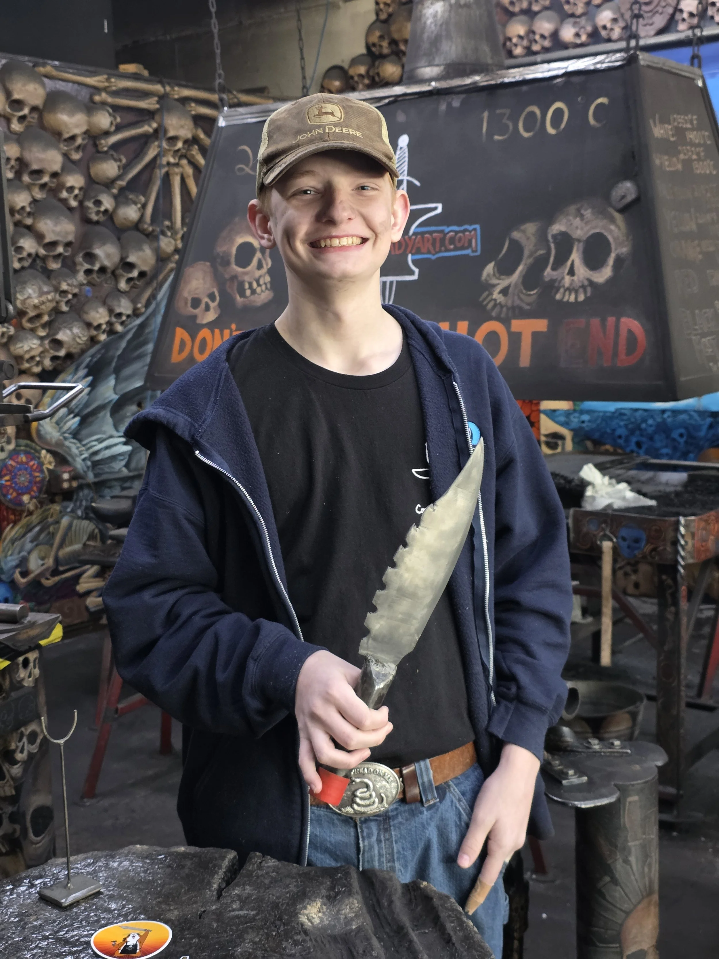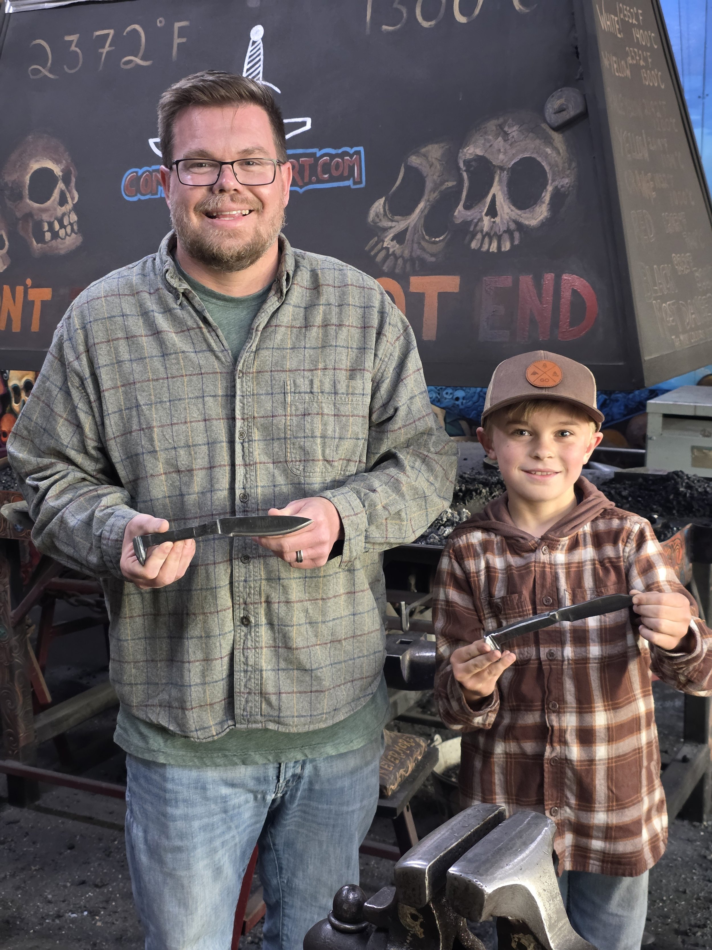 Very fun class this morning with these three making Railroad Spike Knives! This was Aiden's second time in the forge, so he made a dagger. Nice job by all 3!