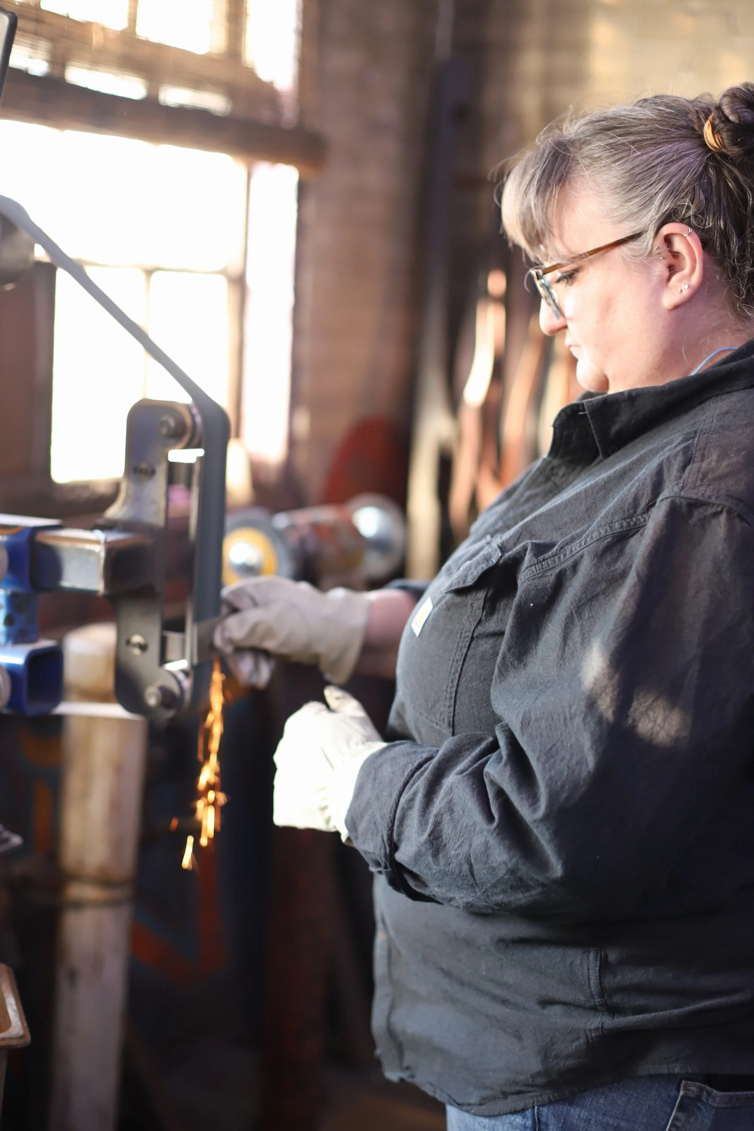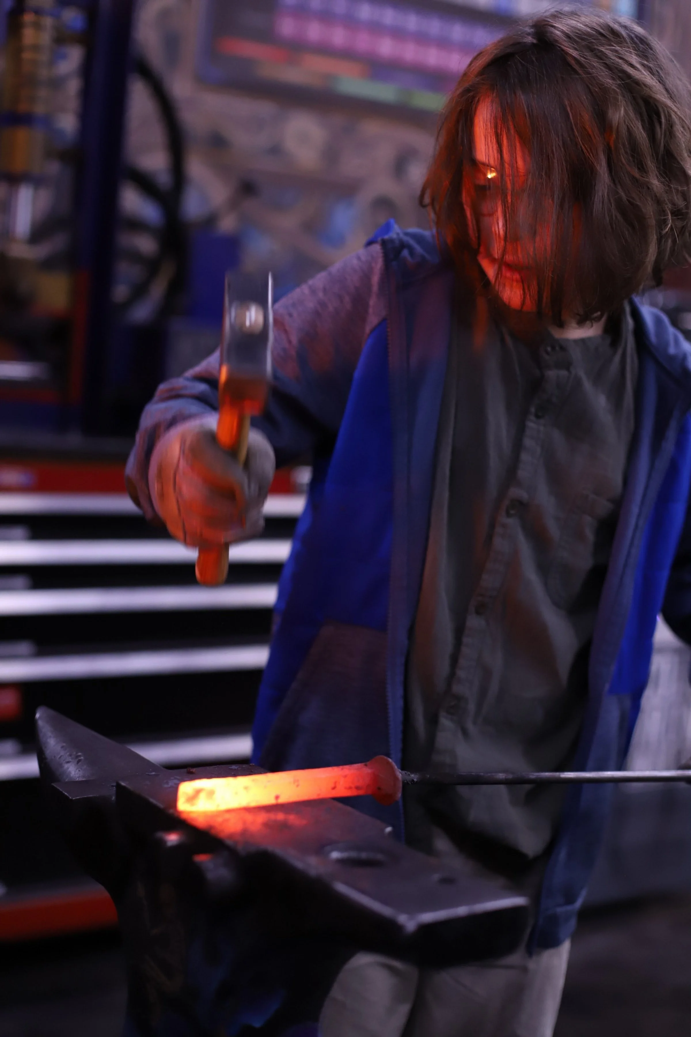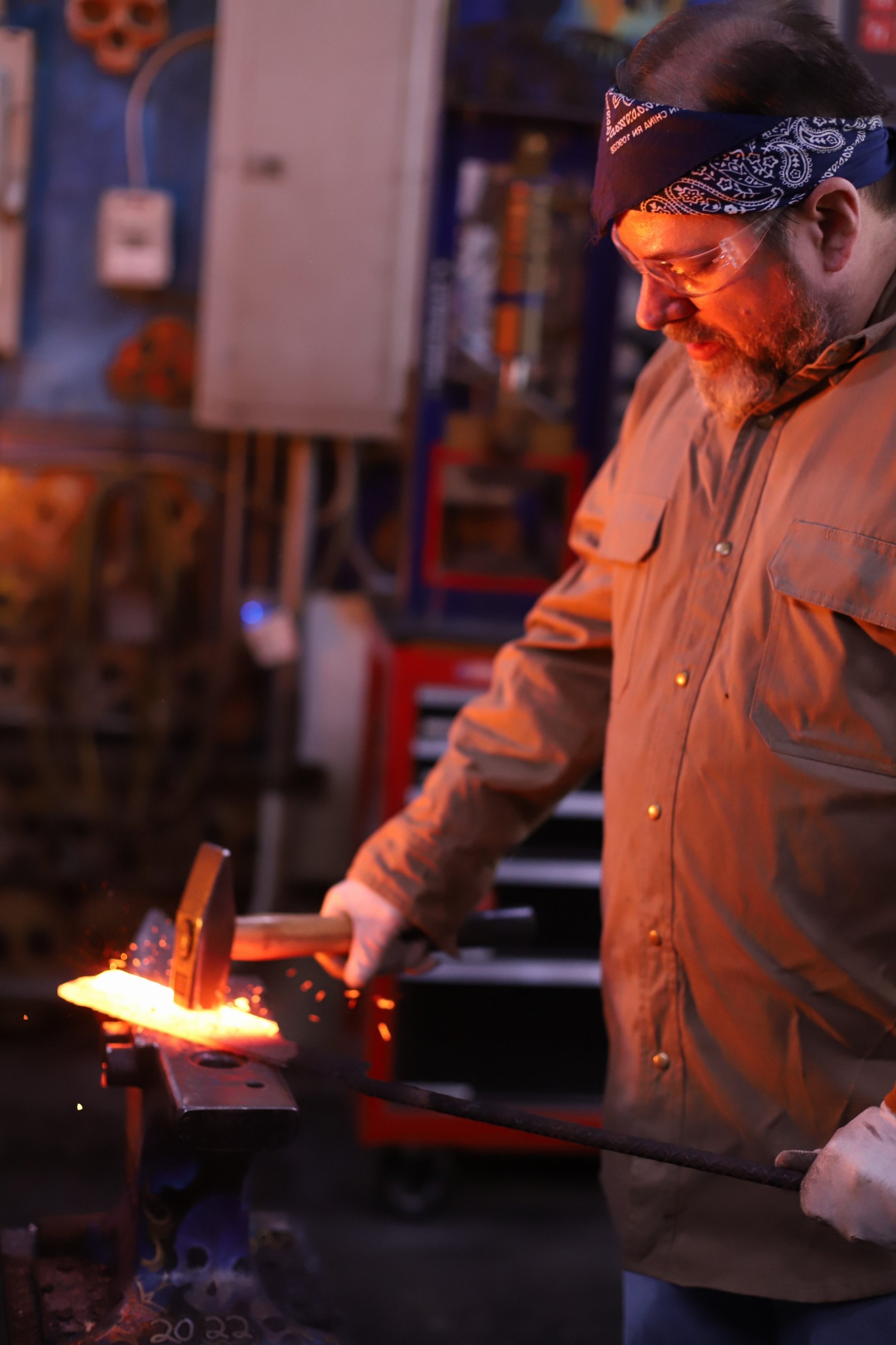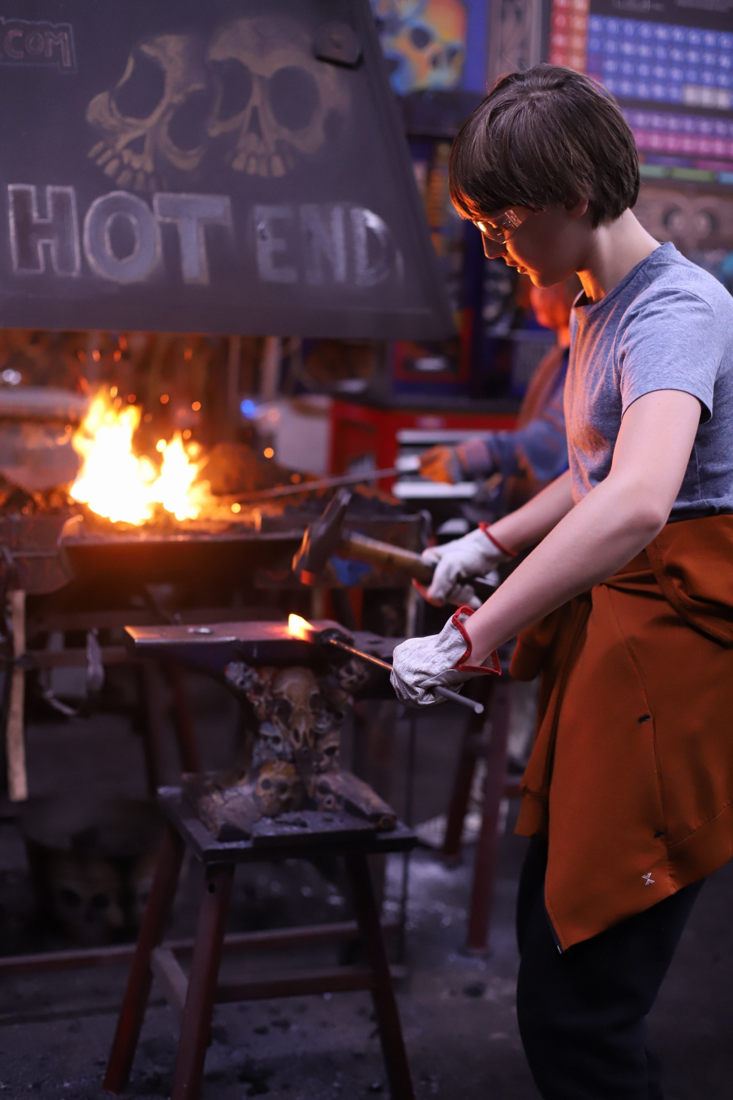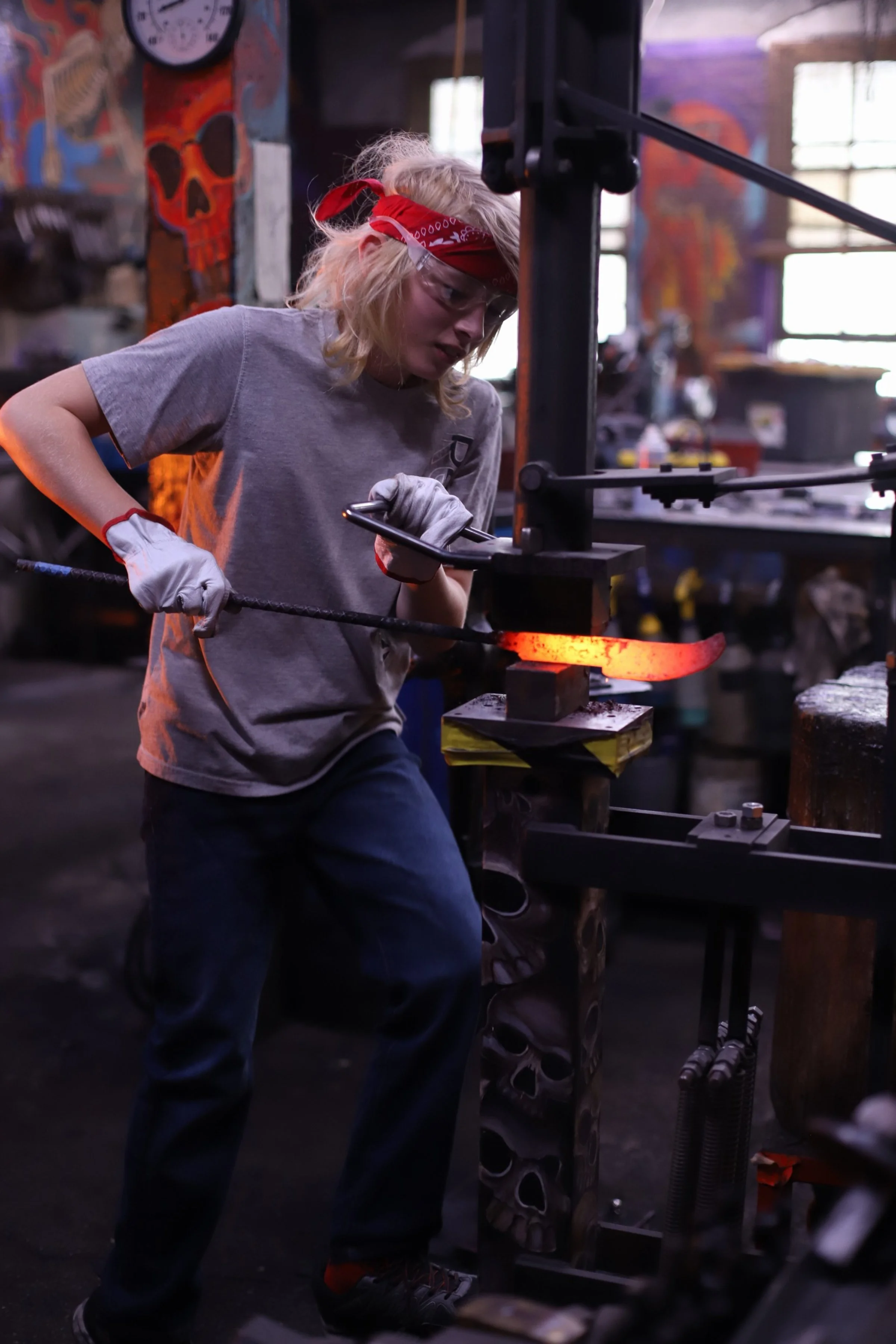 Kevin and Marrissa made absolutely beautiful knives today! Mar did a super shiny, and sharp Railroad Spike Knife. And Kevin, who has been here before, made a fantastic cleaver!