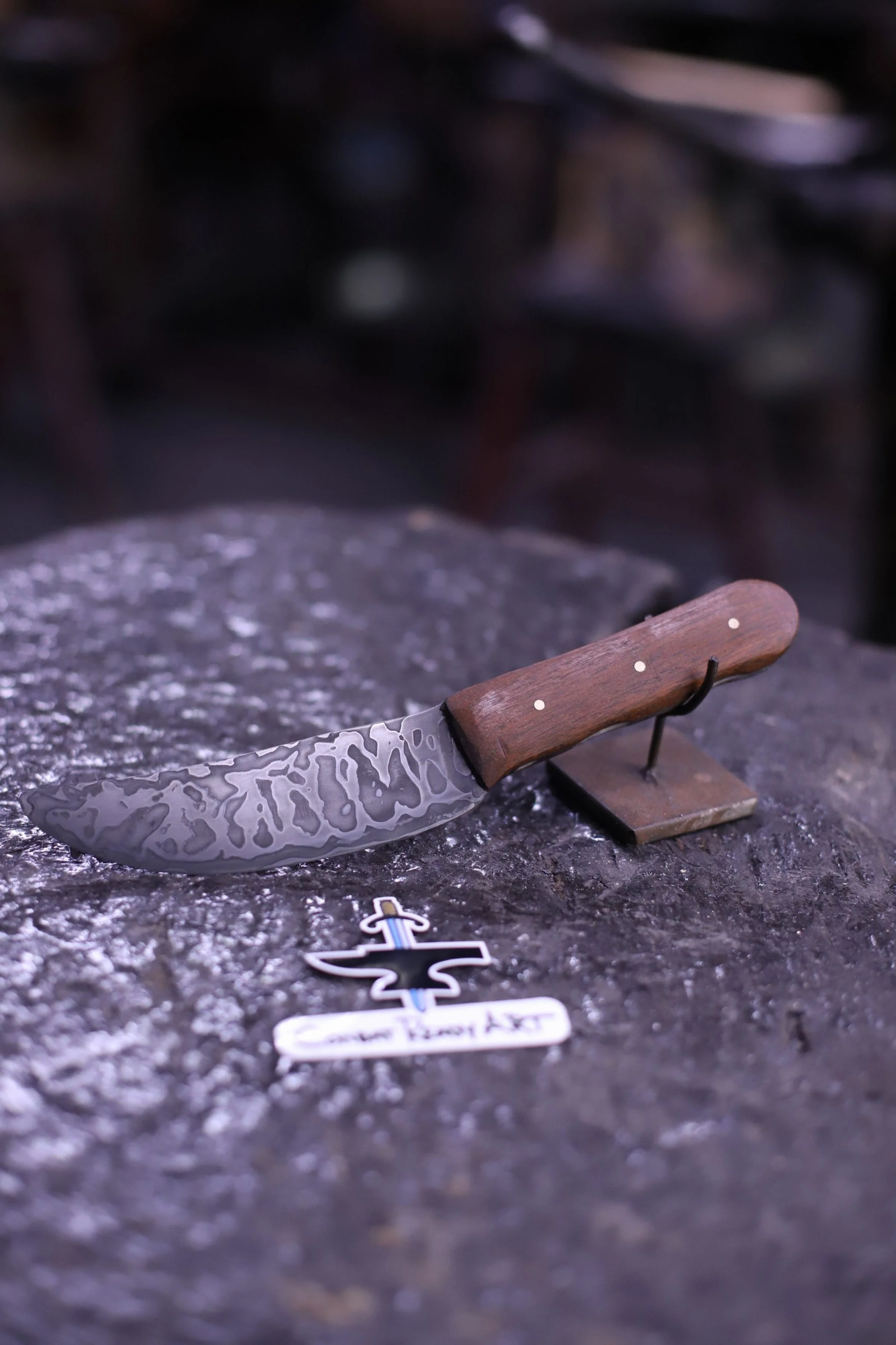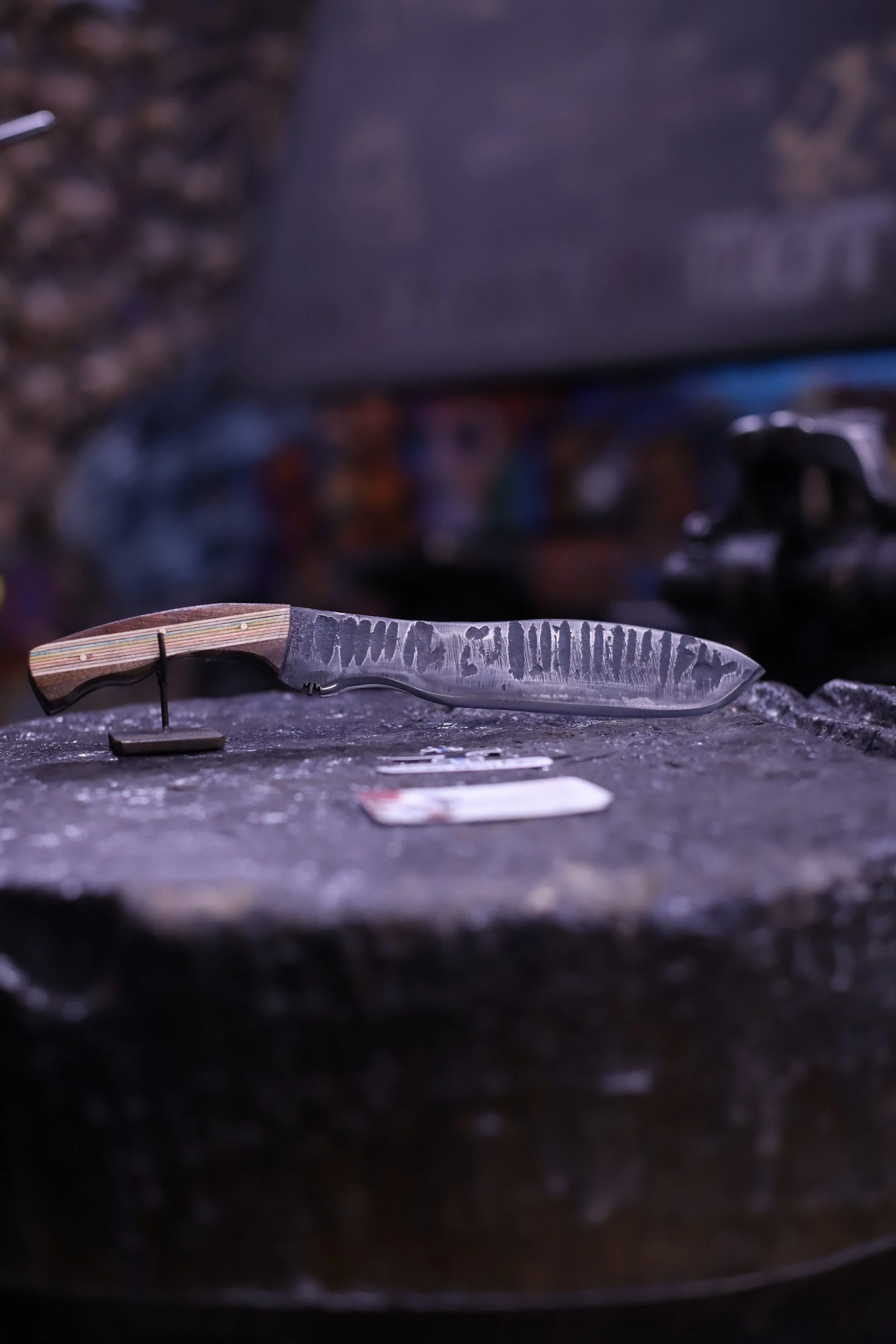Kate and Landen finished their Billet Knives today. They're both fantastic! Landen is a Serbian Chef Knife inspired cleaver, with a bushcraft finish and oak handle. Kate's is a Kukri with a "tiger stripe" bushcraft finish and a stabilized wood handle.