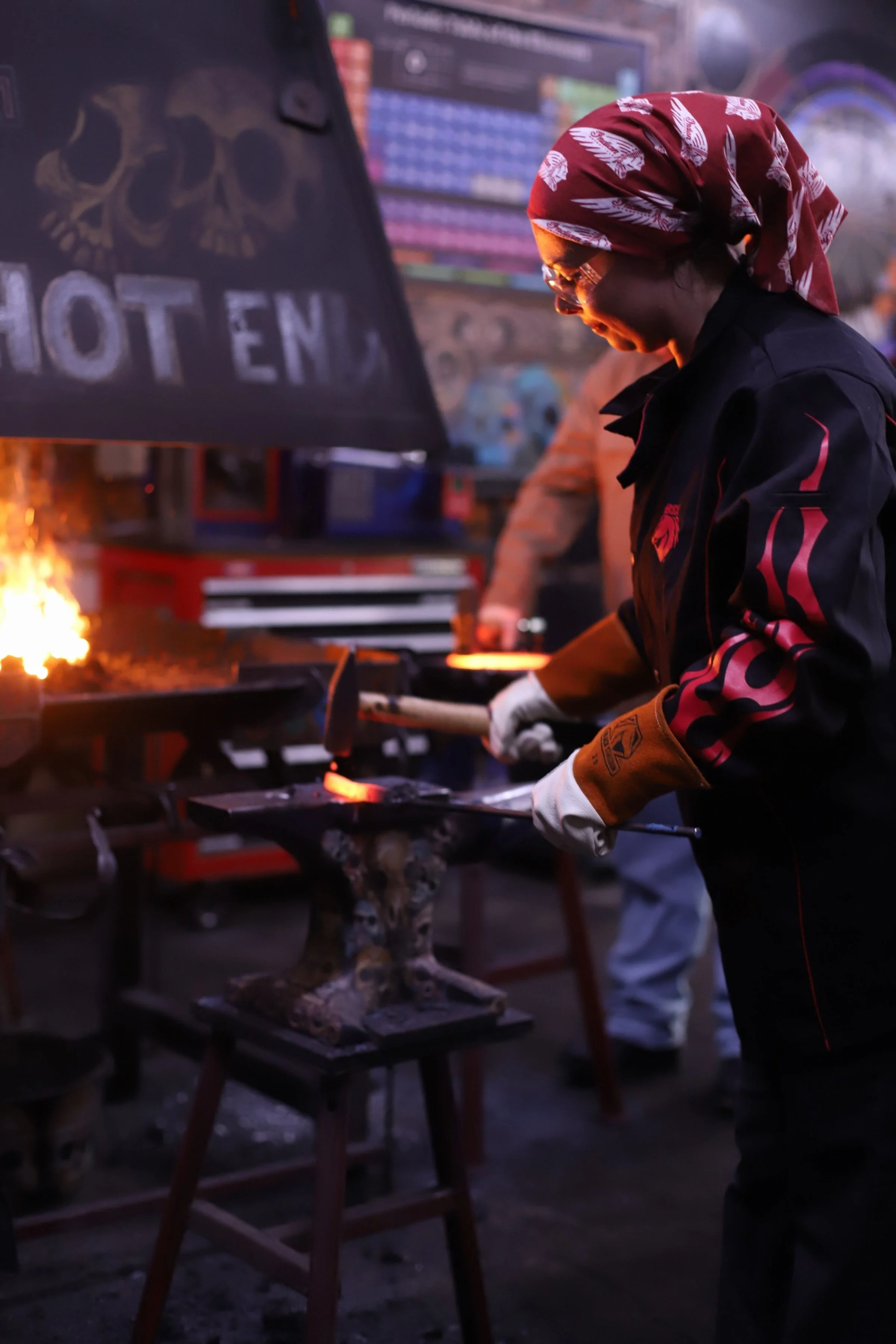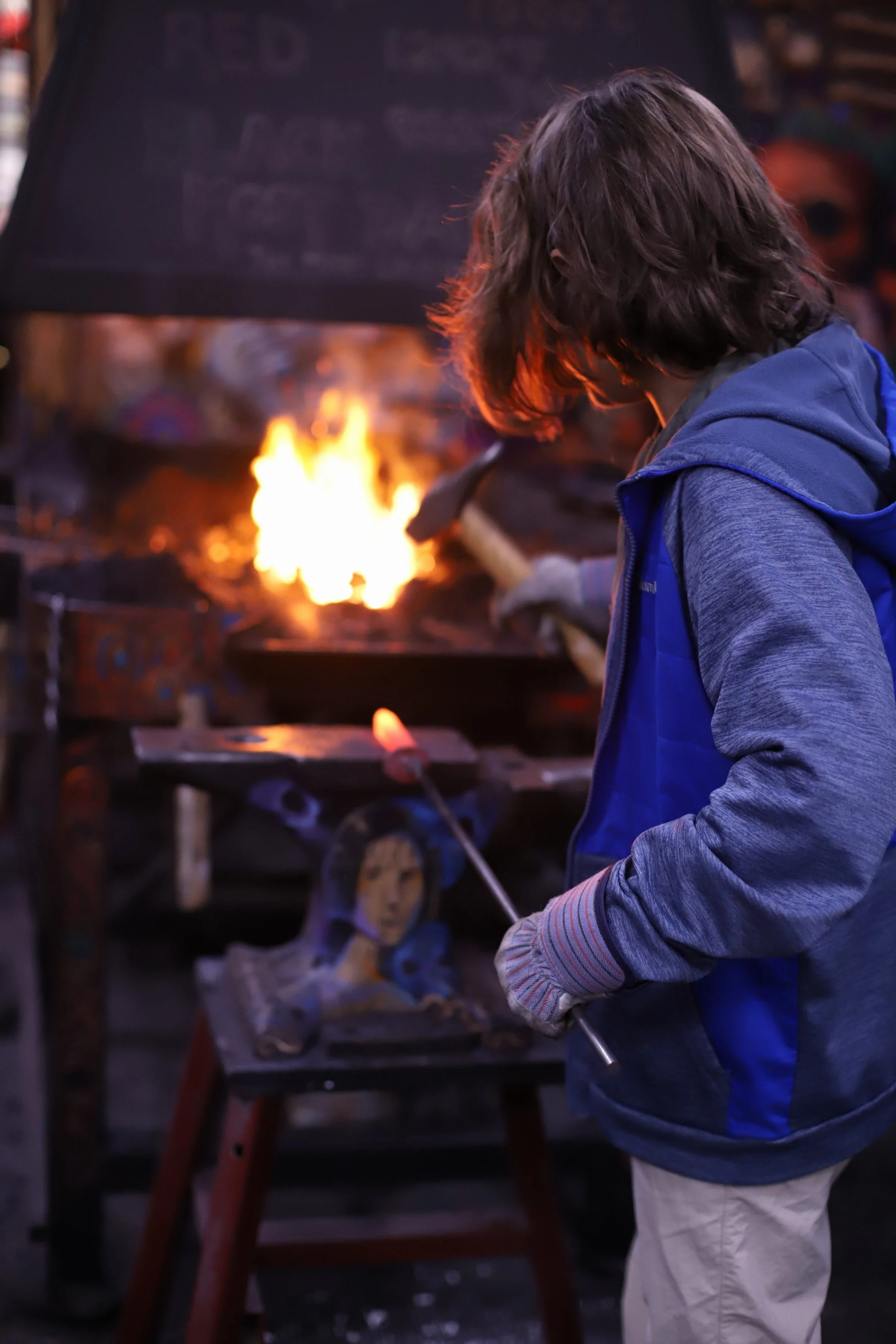 Mandi and her father William were back yesterday and brought her son Will! Will made his first knife, a great Railroad Spike Knife, while Manfi and William started their first Damascus knives. They both started with 9 layers, got the first forge weld and one fold done to make 18 layers. They continue today!