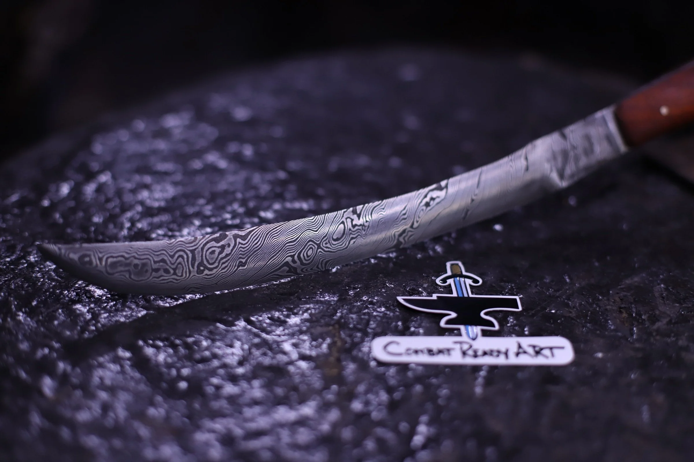 Evan was back this morning to finish his twisted damascus tanto style blade. The pattern of the damascus is absolutely stunning! And looks beautiful with the African Paduk handle and mosaic pin.