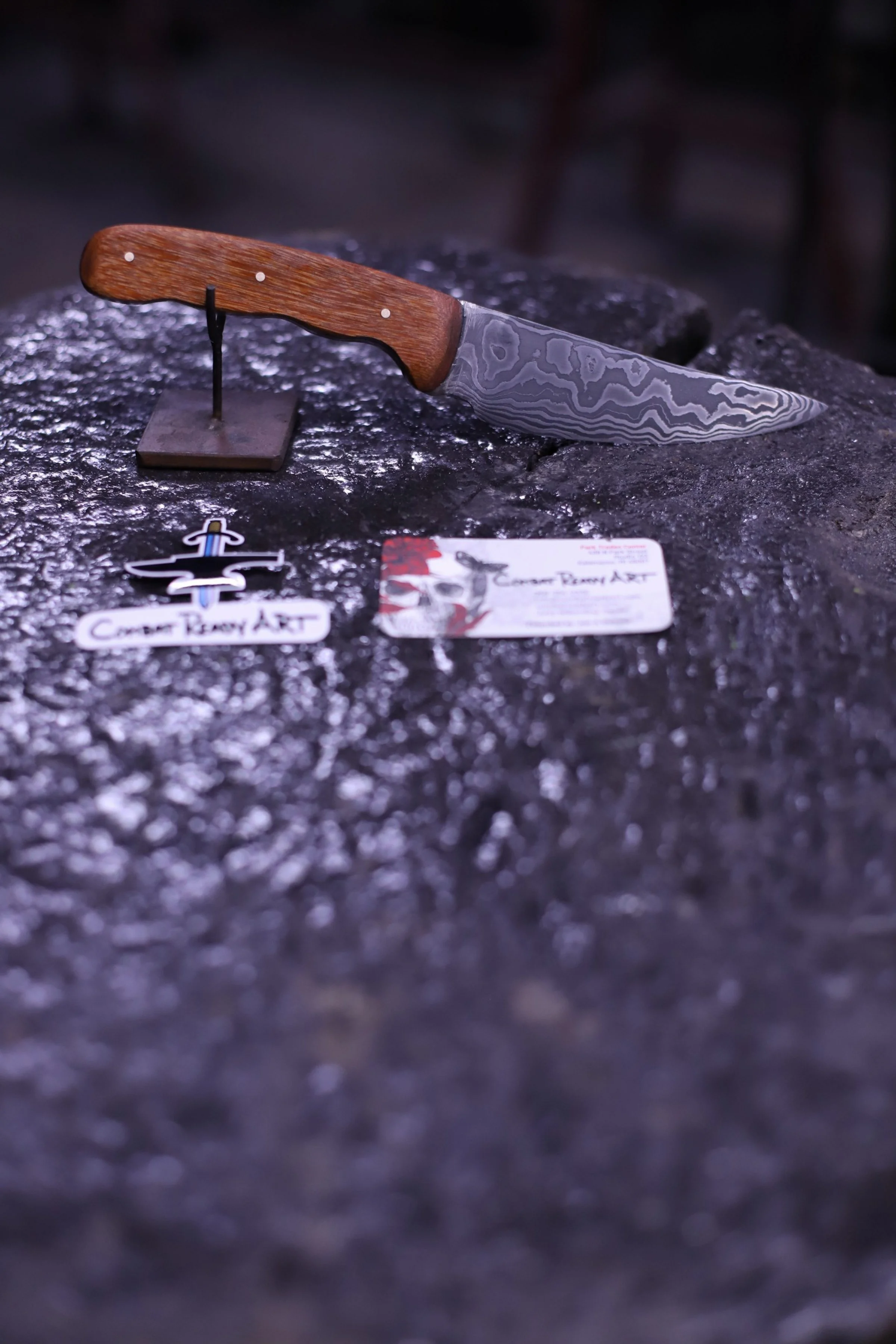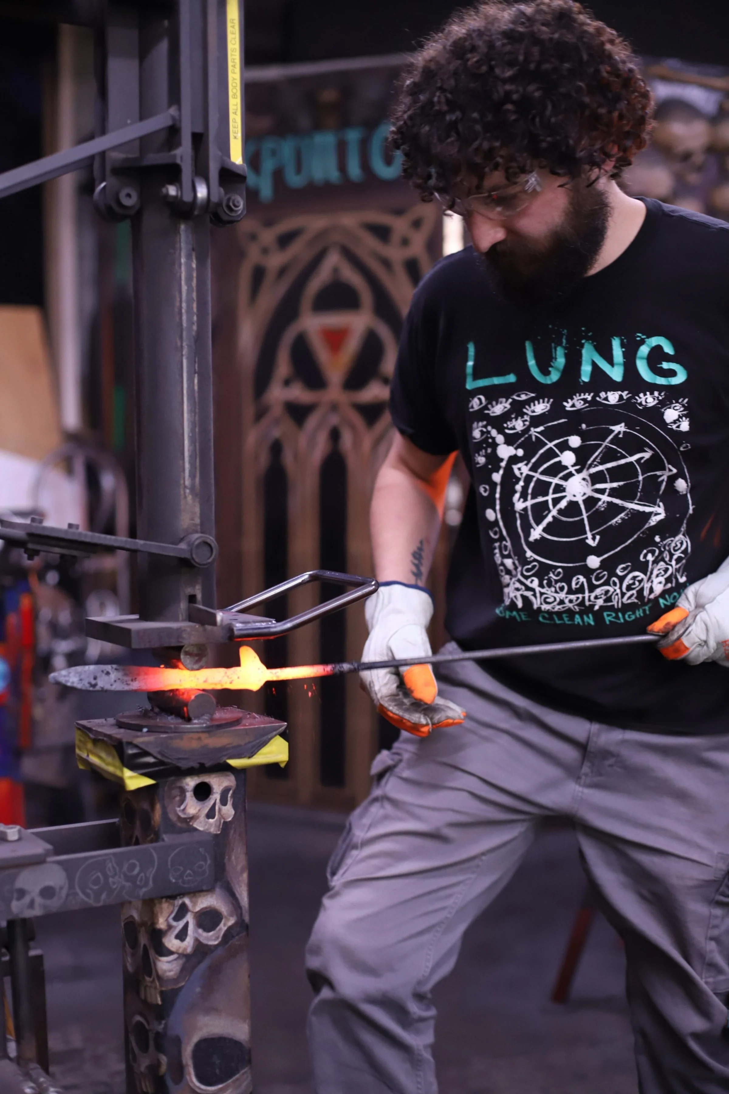 Daren was back today! Last time he made a railroad spike knife. Today is made a fantastic Scary Cheese Knife! Really nice artistic choices!
