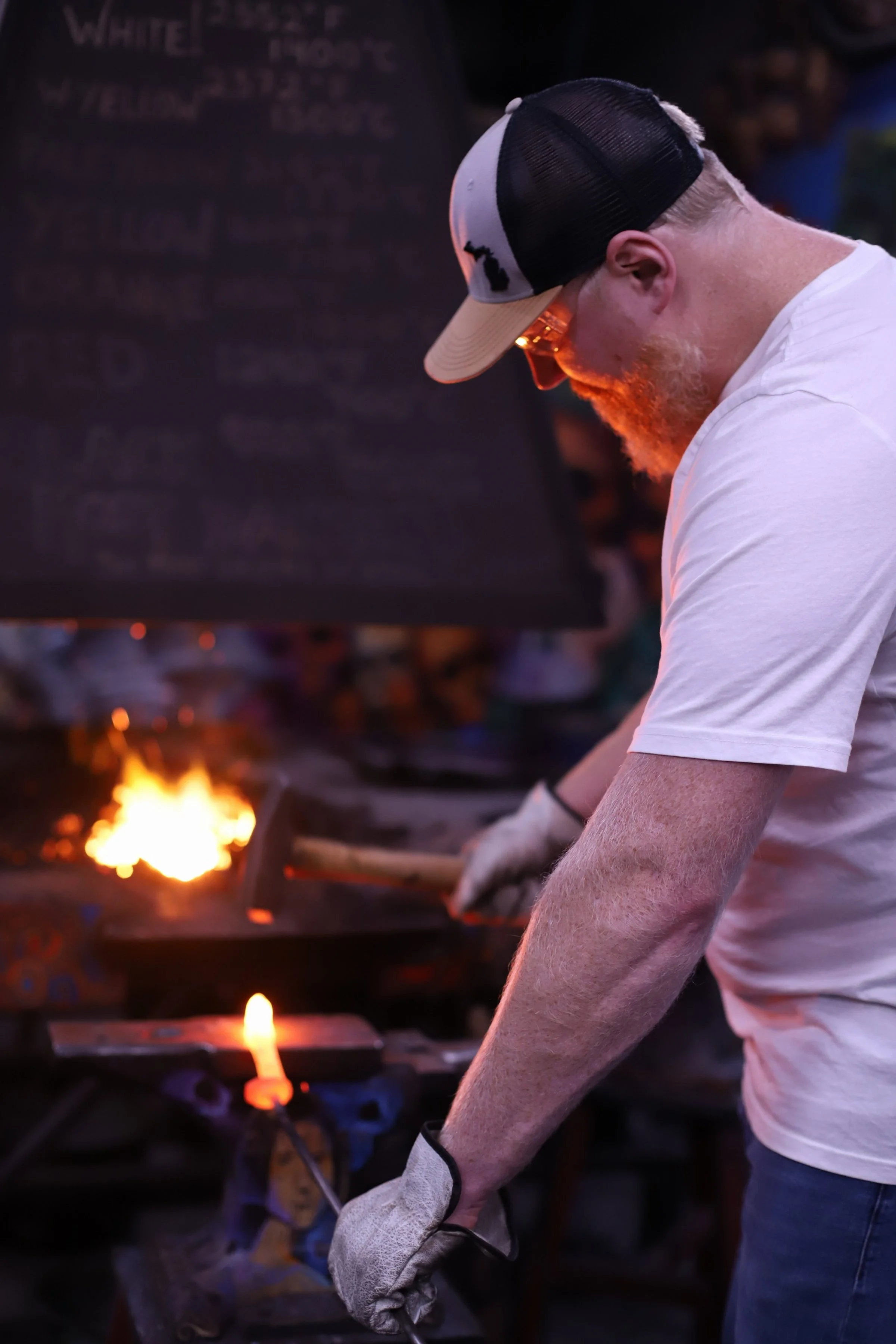 More family time in the forge! Crystal and Chris' son came with them today. He made one of the shiniest Railroad Spike Knives I've seen! Crystal made a couple of candy canes! And Chris finished his gorgeous damascus blade! Its beautiful, but, man, you feel powerful holding it! Great job!