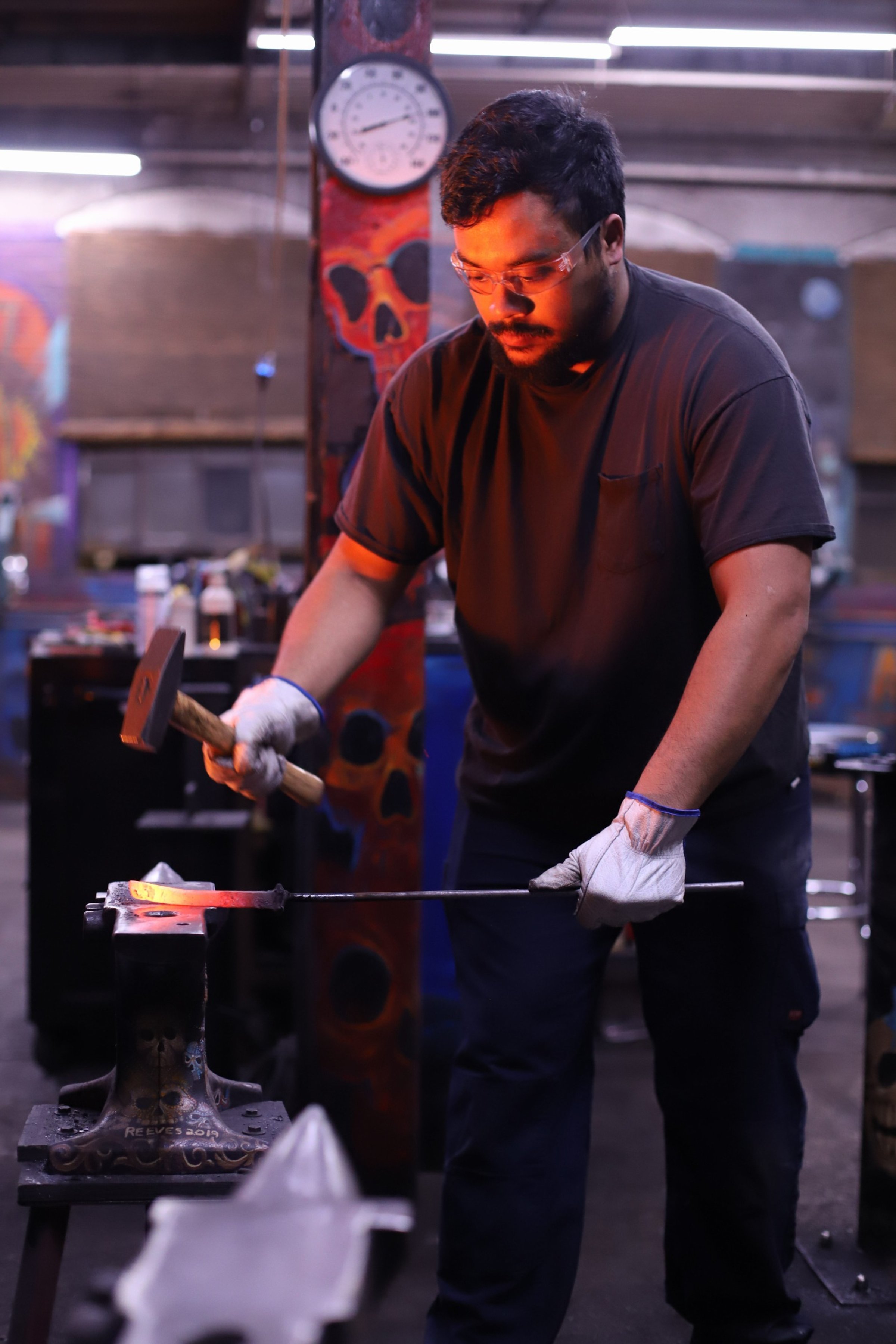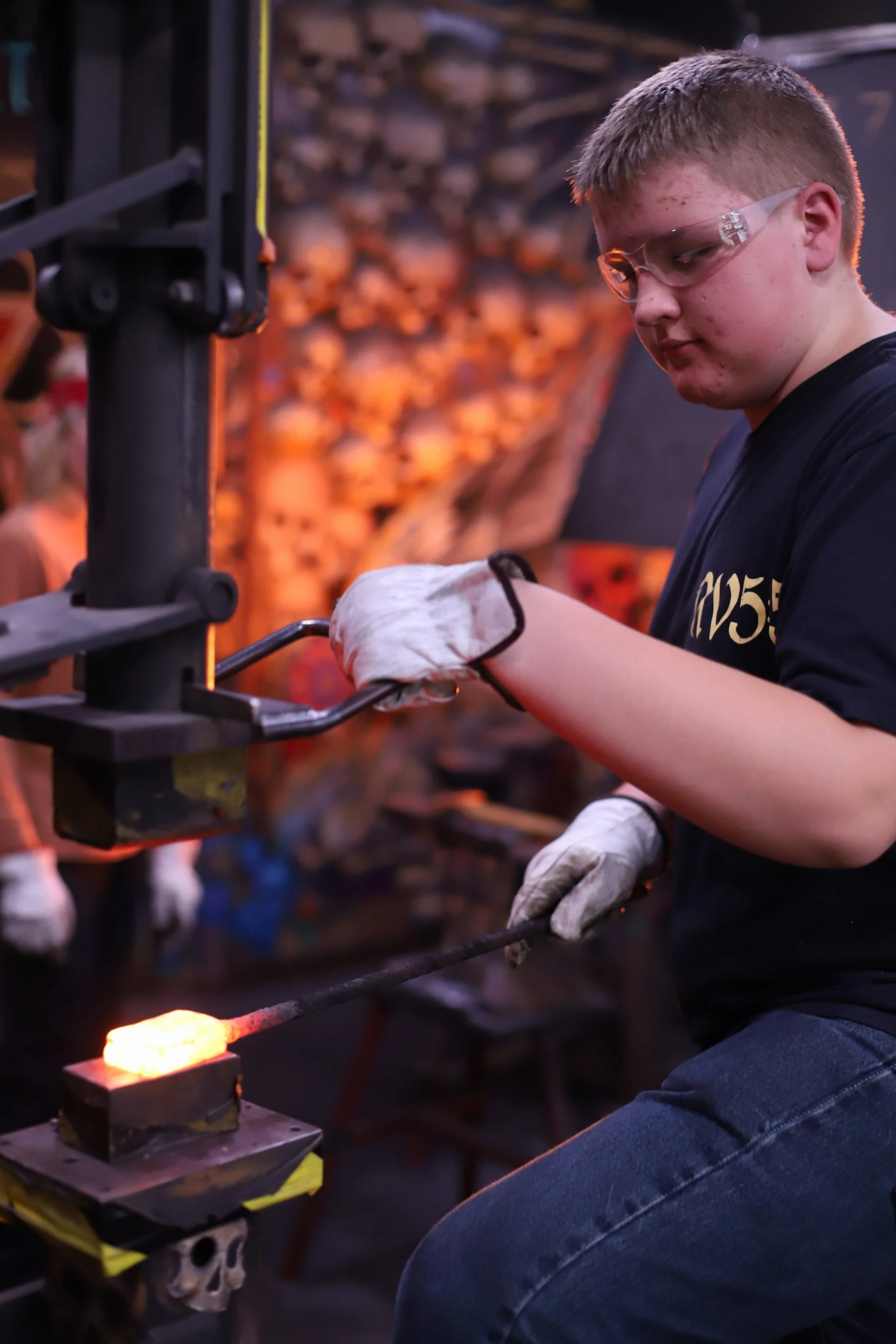 Because Thanksgiving is next Thursday, the older Level 2 Homeschool class came today. Ben finished hammering out his damascus blade shape, got through grinding, and to the final acid etch. Cruz got all of his folds done on his damascus, and most of the blade shaped. Nicely done to both of them!