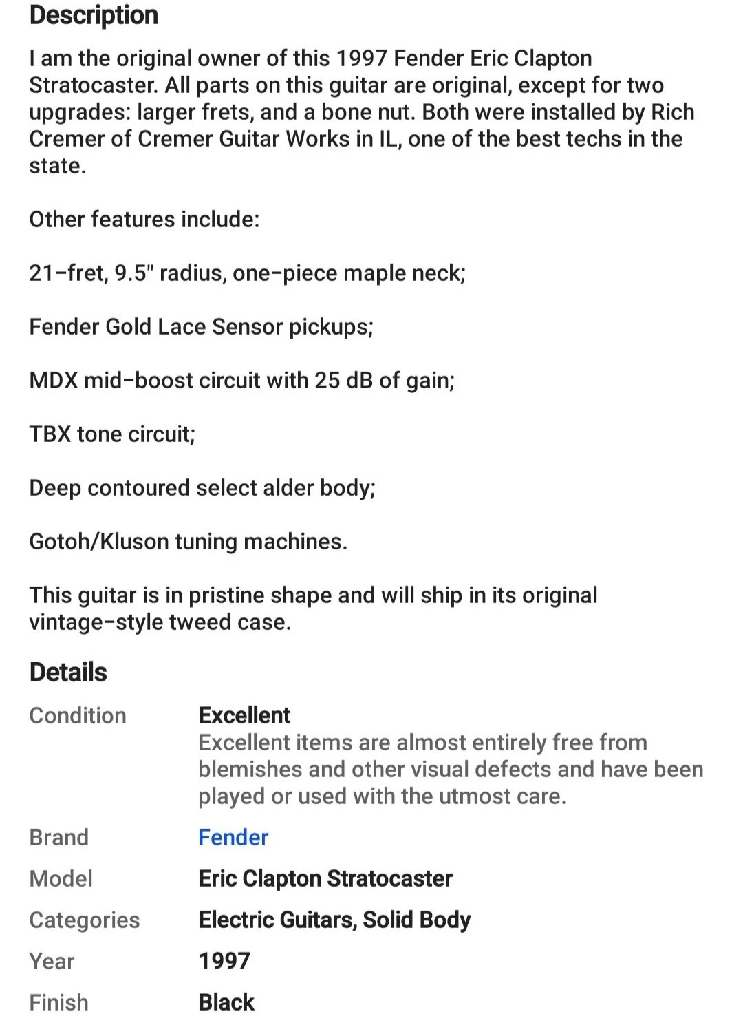 Fender Eric Clapton Strat, 1997$1500Please email, text, or call me if interested.info@combatreadyart.com or 269-254-2335 View fullsize View fullsize View fullsize View fullsize View fullsize View fullsize