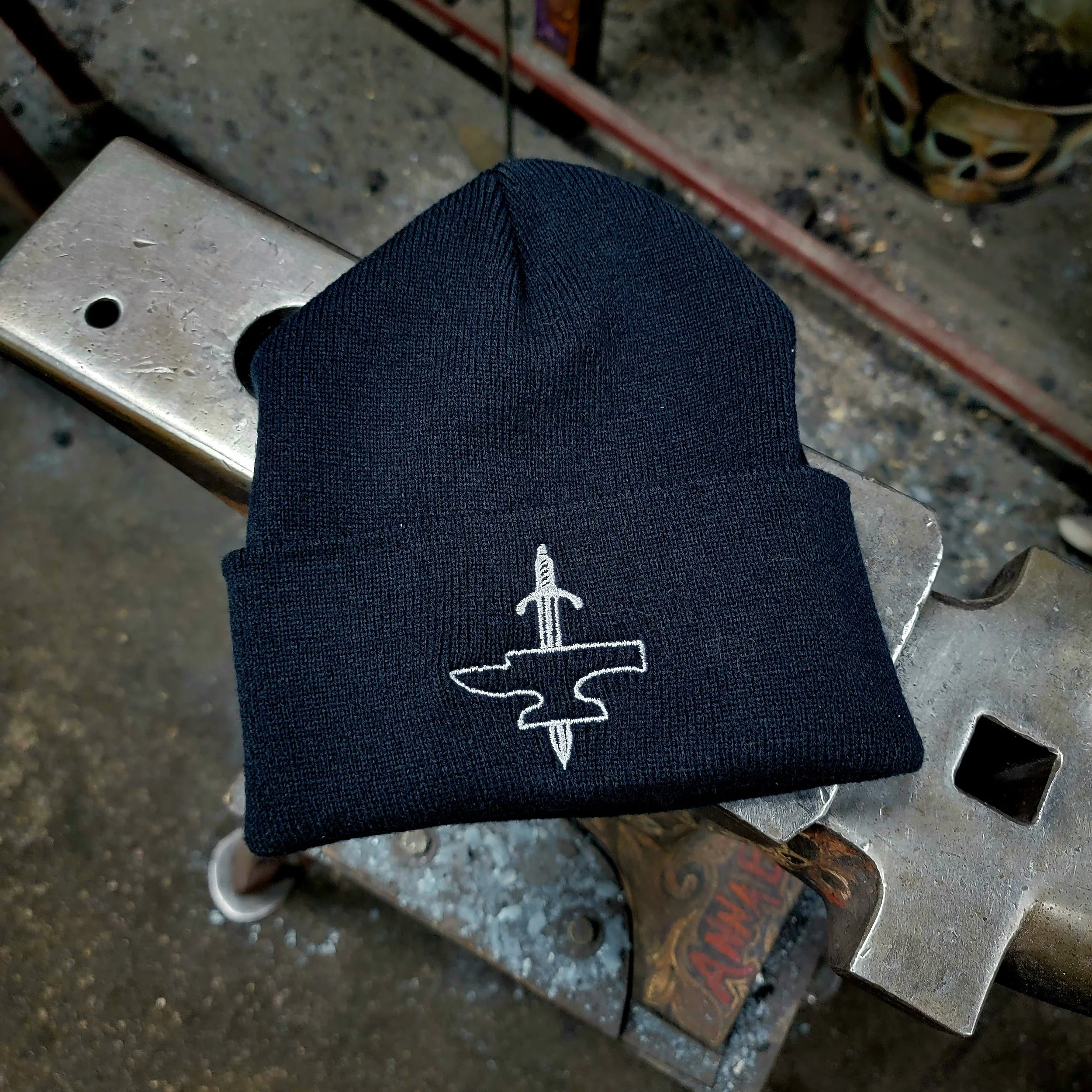 Stay warm when you’re not in the forge! Black knit hat with the Combat Ready Art logo embroidered on the front.
